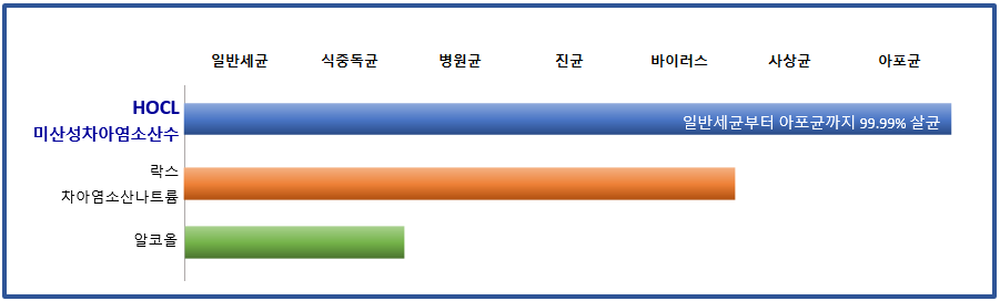 조류독감바이러스 사멸을 위해 진행한 실험결과를 발표한 미 국립 보건의학연구소 도서관의 보고서에 따르면 미산성 차아염소산수(HOCL)가 차염소산이온보다 120배 살균력이 강하다고 되어 있습니다.