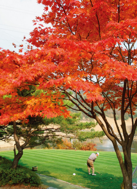 지금 골프장에는 형형색색의 단풍이 짙게 물들어 있다. 노란 은행나무 잎을 배경으로 빨간 단풍이 어우러진 자태는 아름답기 그지없다. 나무 아래는 떨어진 낙엽이 만들어낸 울긋불긋한 모자이크가 눈을 현란하게 만든다. 가을 단풍 풍경에 대해 법륜스님이 ‘봄꽃보다 아름답다’고 한 것이 기억난다. 봄꽃은 떨어지면 아무도 거들떠보지 않지만 가을 단풍은 떨어지면 우리를 사색하게 만든다. 티잉 그라운드에서 드라이브 샷을 날리면 하얀 공이 코발트색 하늘을 향해 솟구쳐 오른 뒤 붉은 단풍나무를 지나 황금빛으로 변한 잔디에 안착한다.