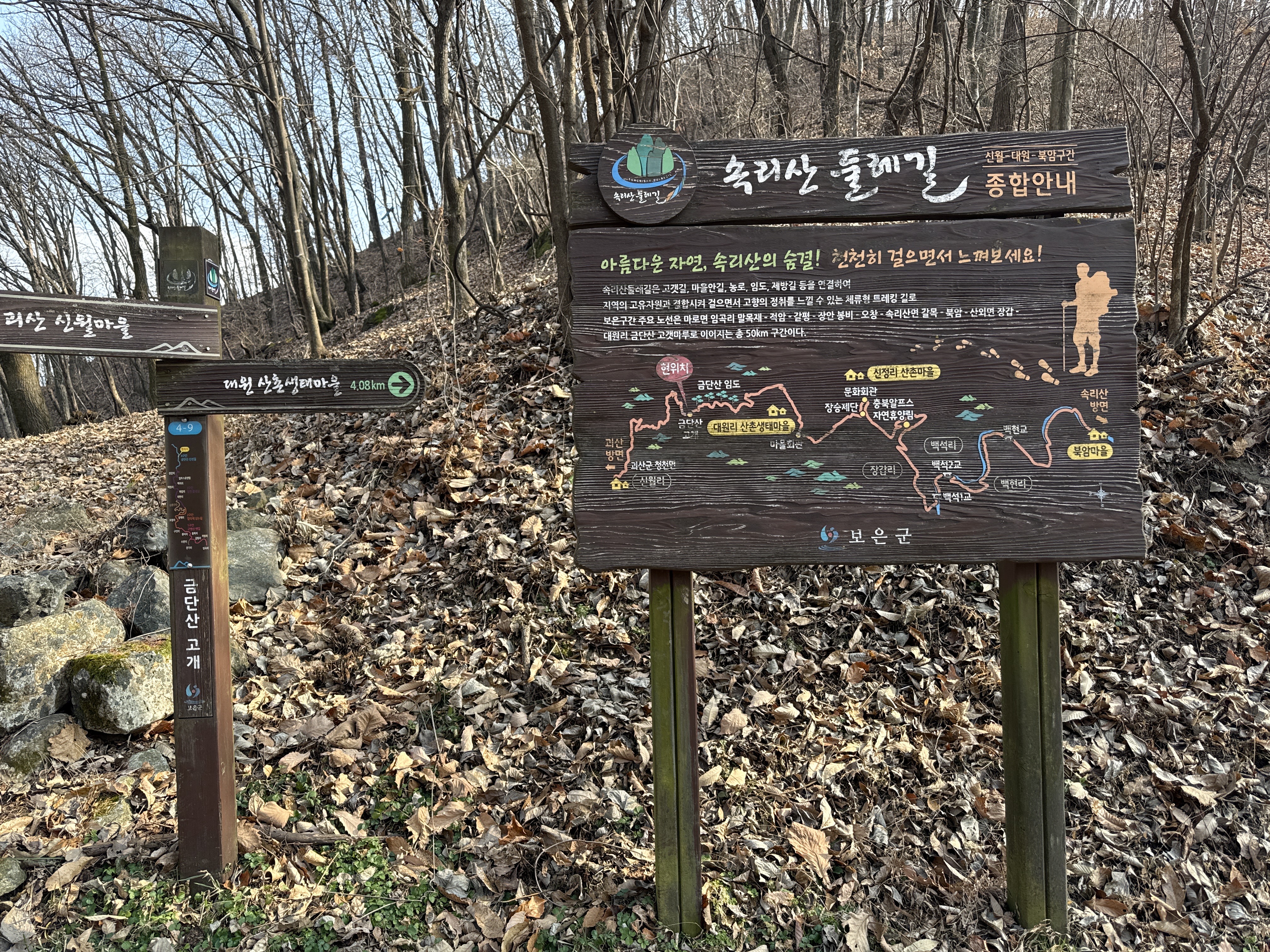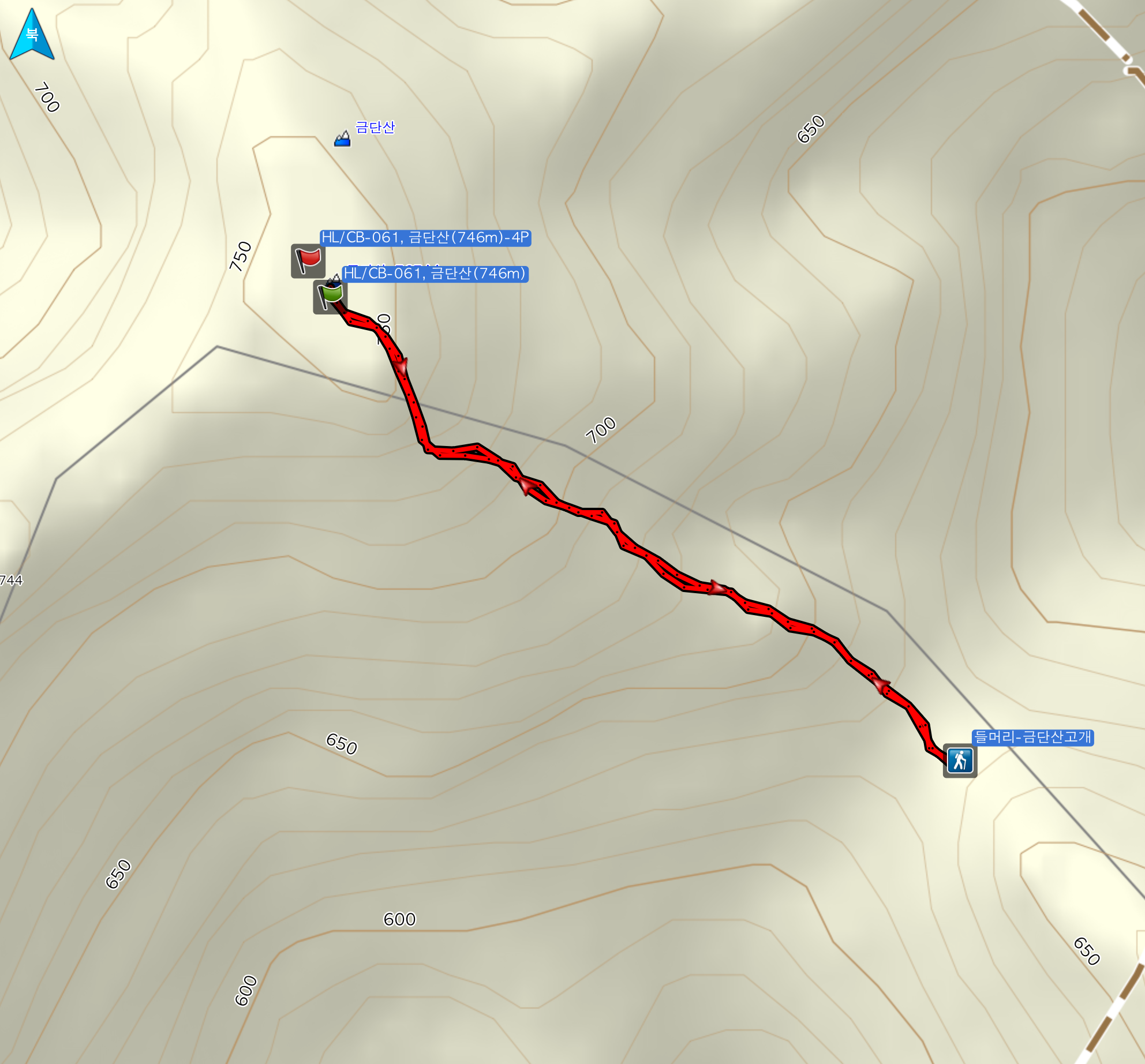 - 들머리(좌표) : (N36.61196° E127.78933°)-금단산 고개 (산불예방기간에는 임도 통제되고 있다)