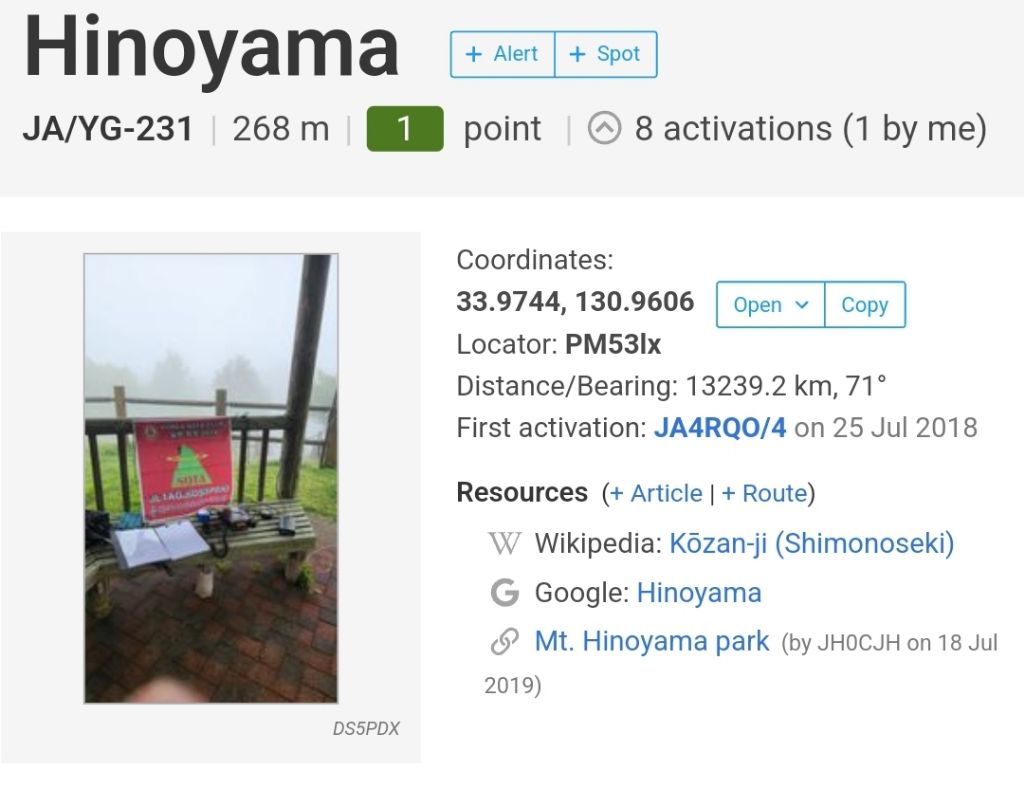 첫번째 소타운용 예정지는 2월16일 오전 야마구치현 시모노세키의 JA/YG-231 불의산 히노야마 입니다.