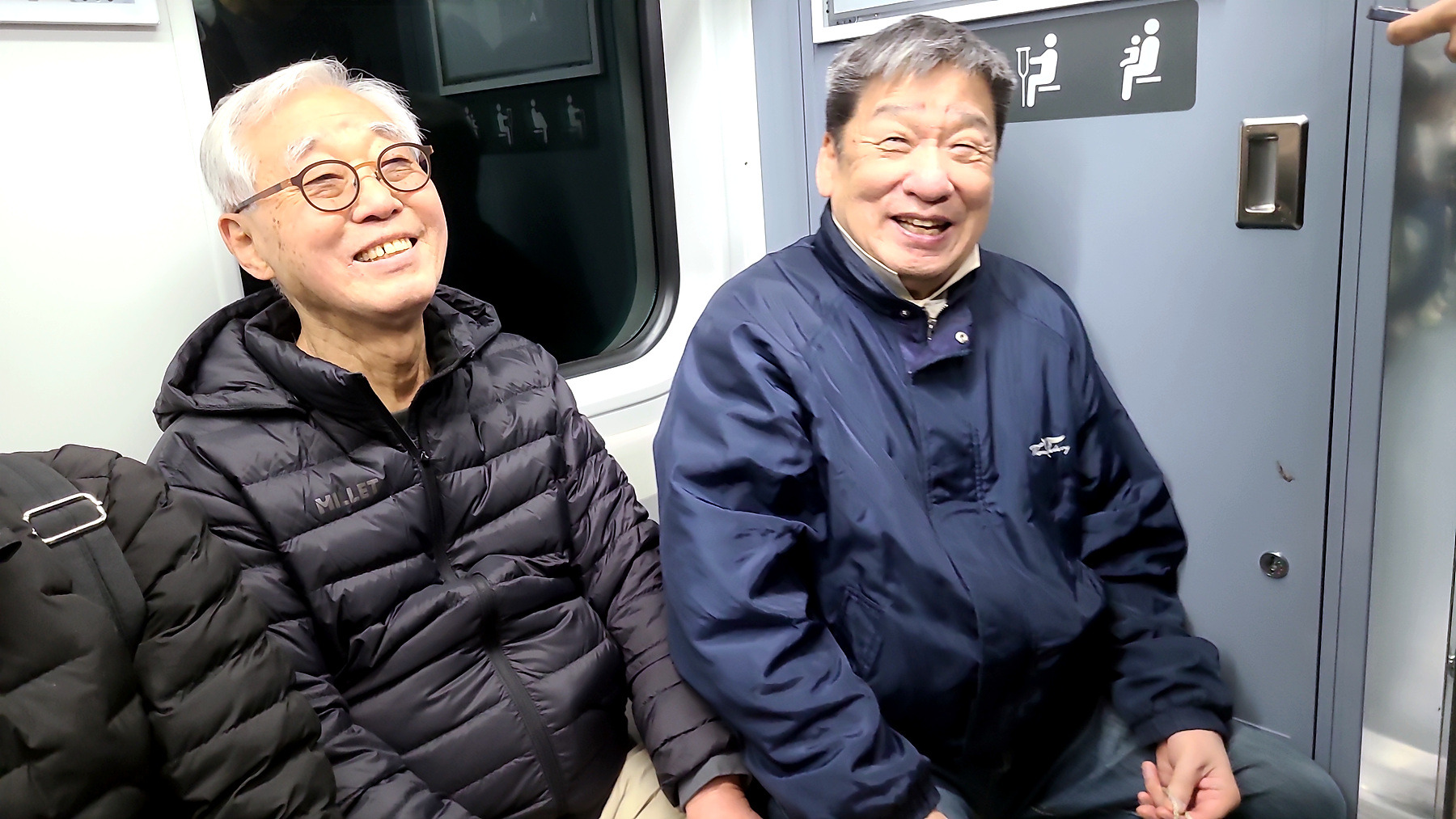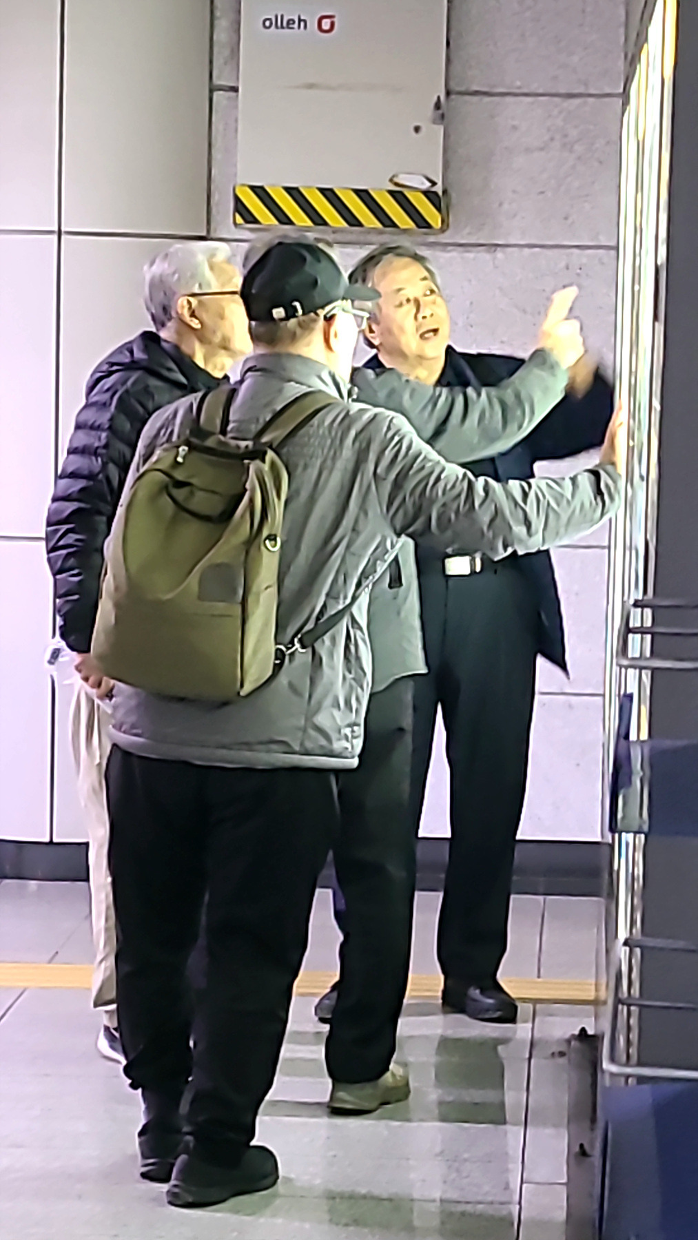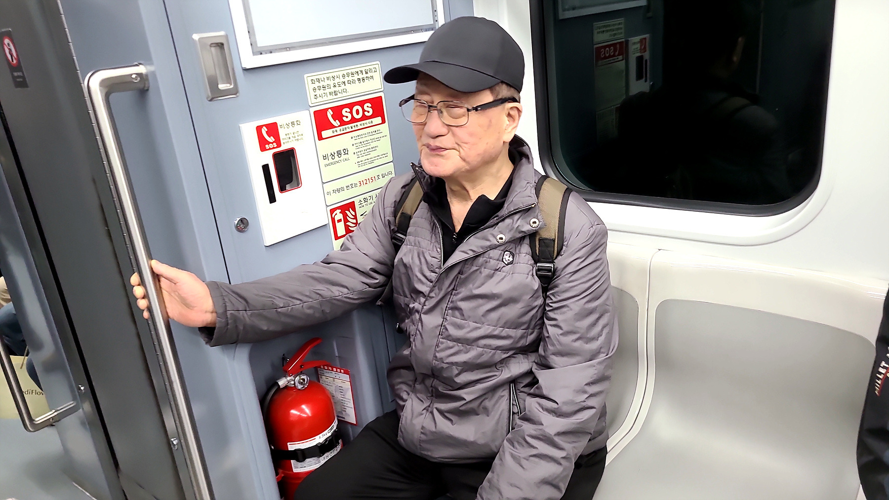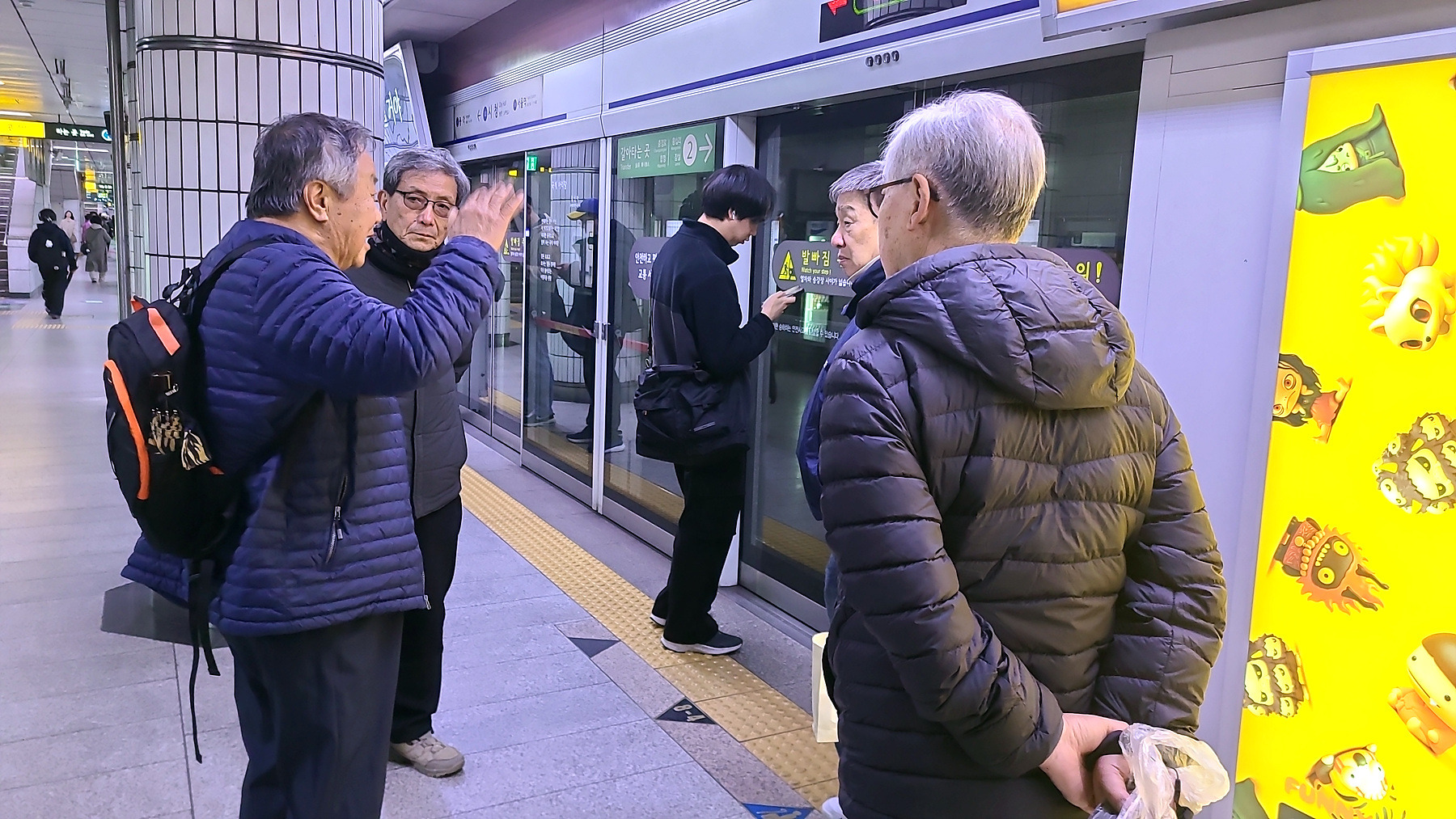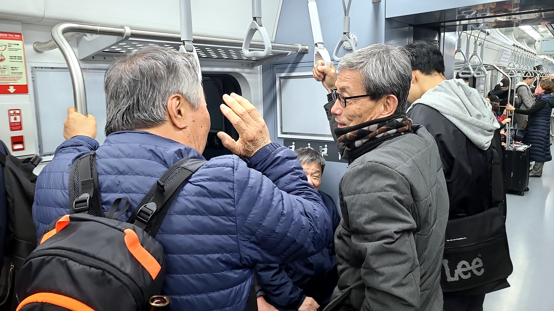 승강장에서 지하철을 기다리는 모습과 승차 후 지하철 객차 안에서의 모습들...