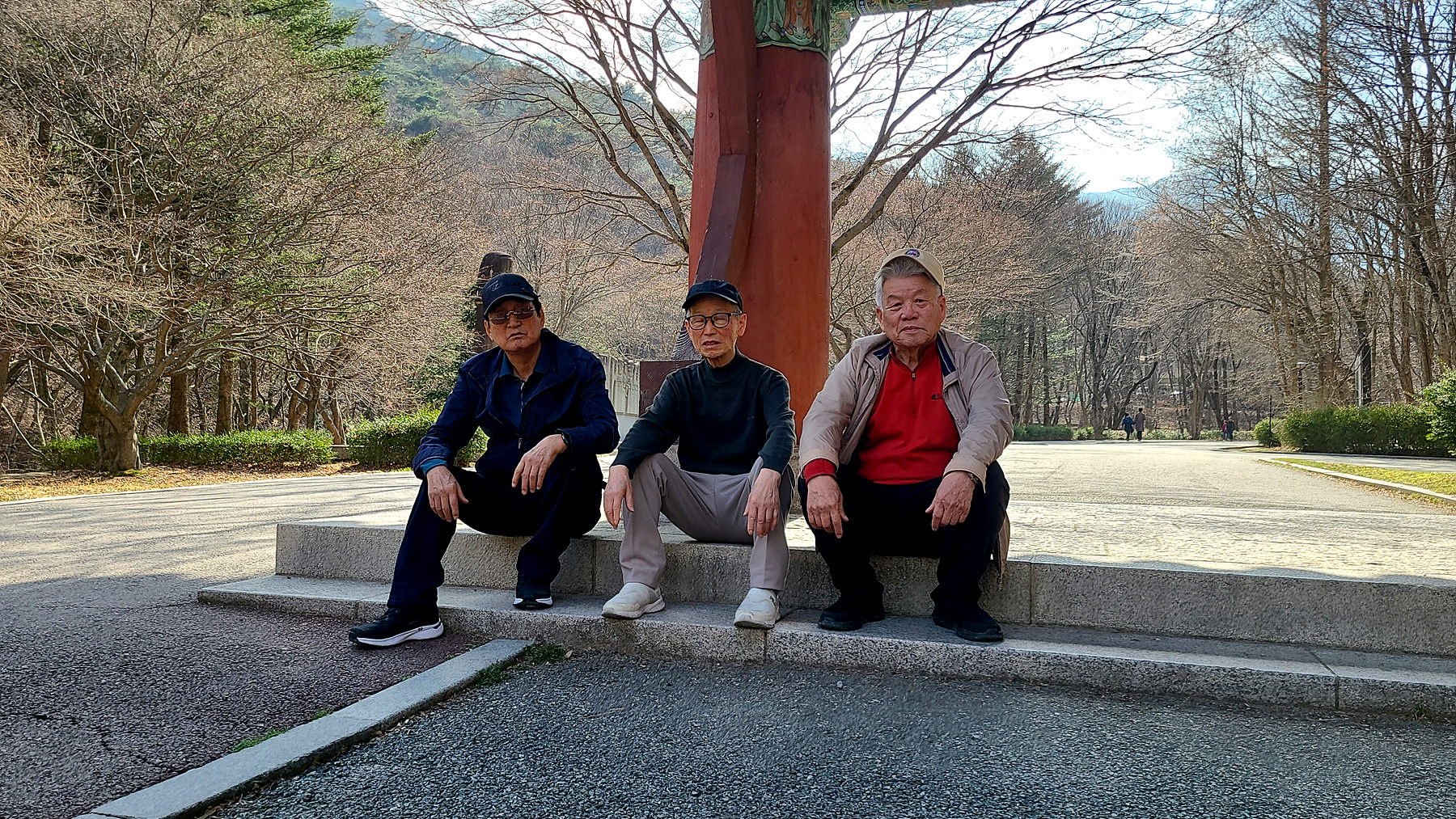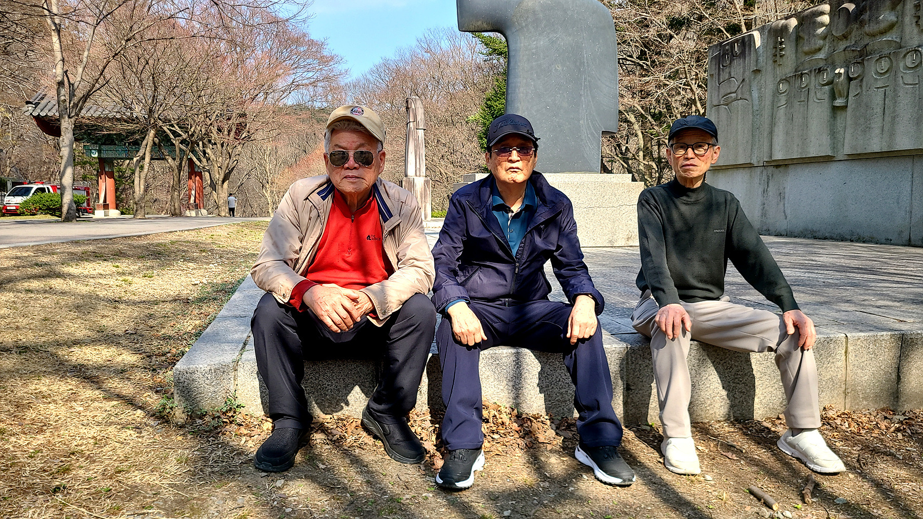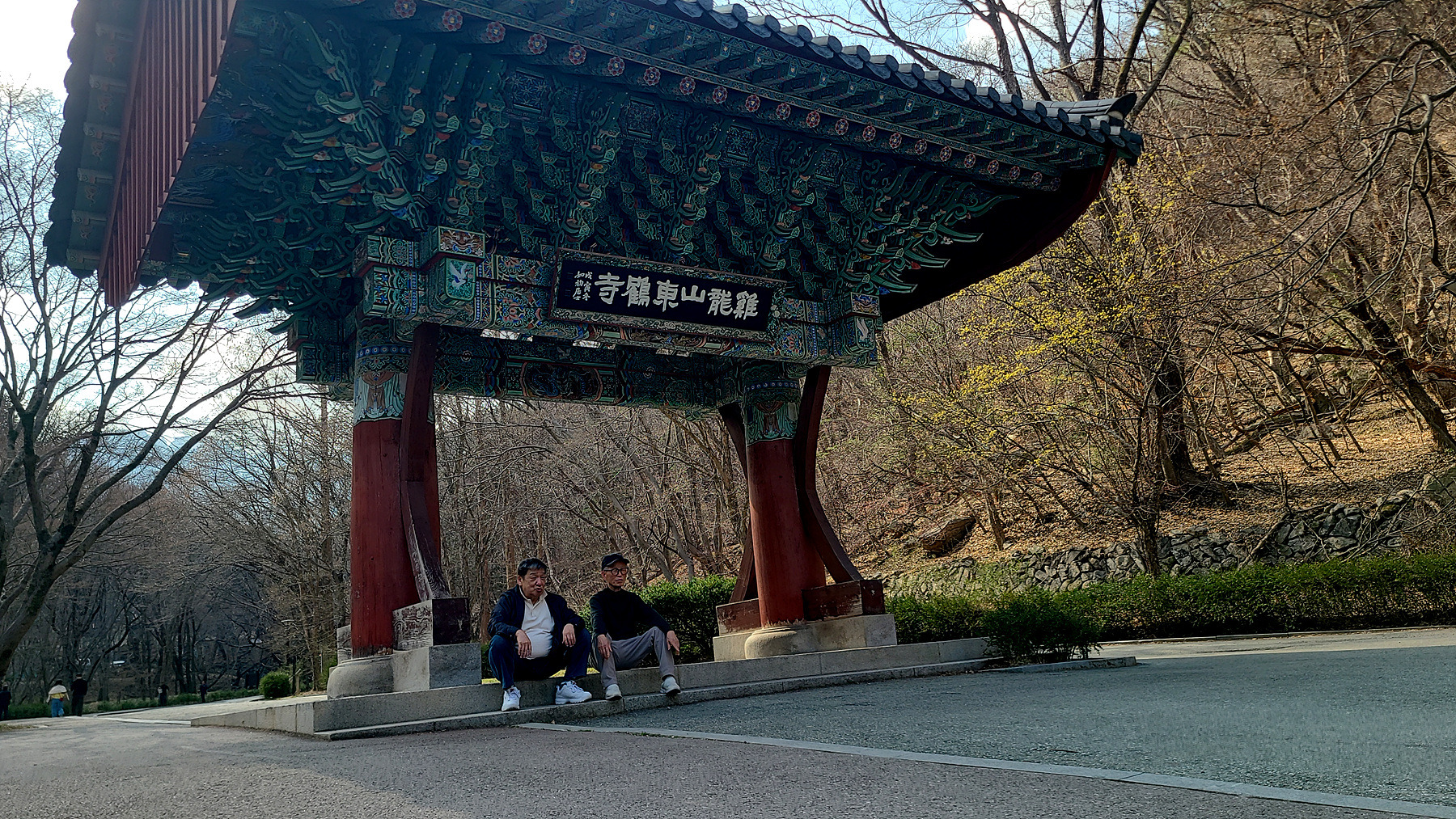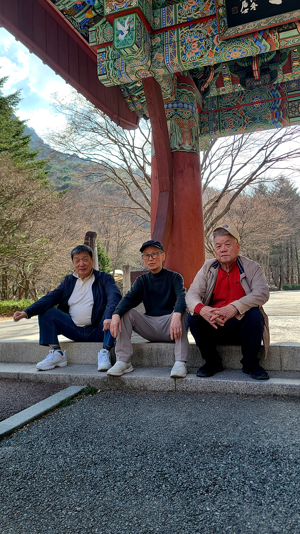일주문 문턱(?) 과 부근의 석조형물 앞에서 잠시 머물며 휴식을 취하는 일행...