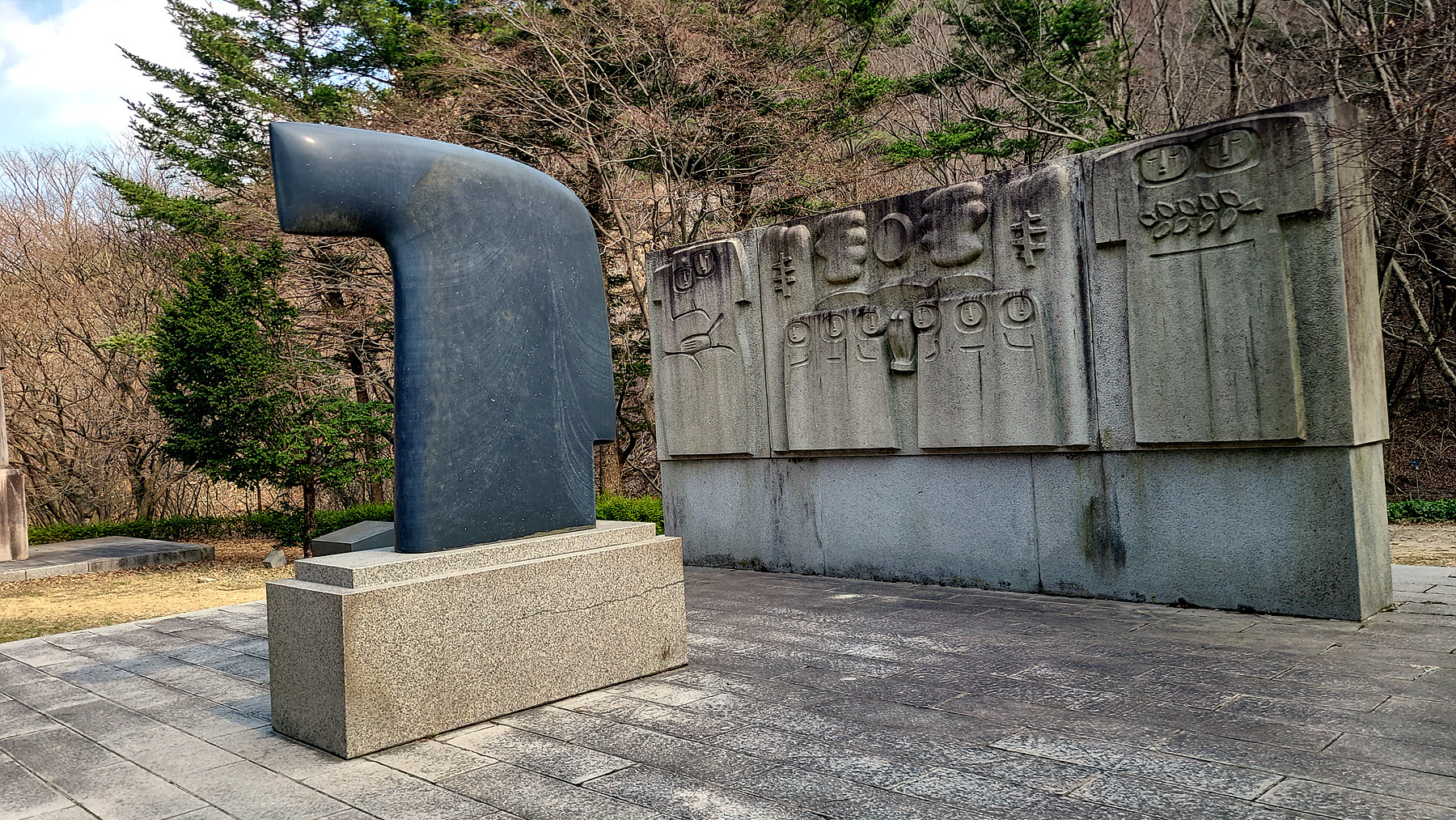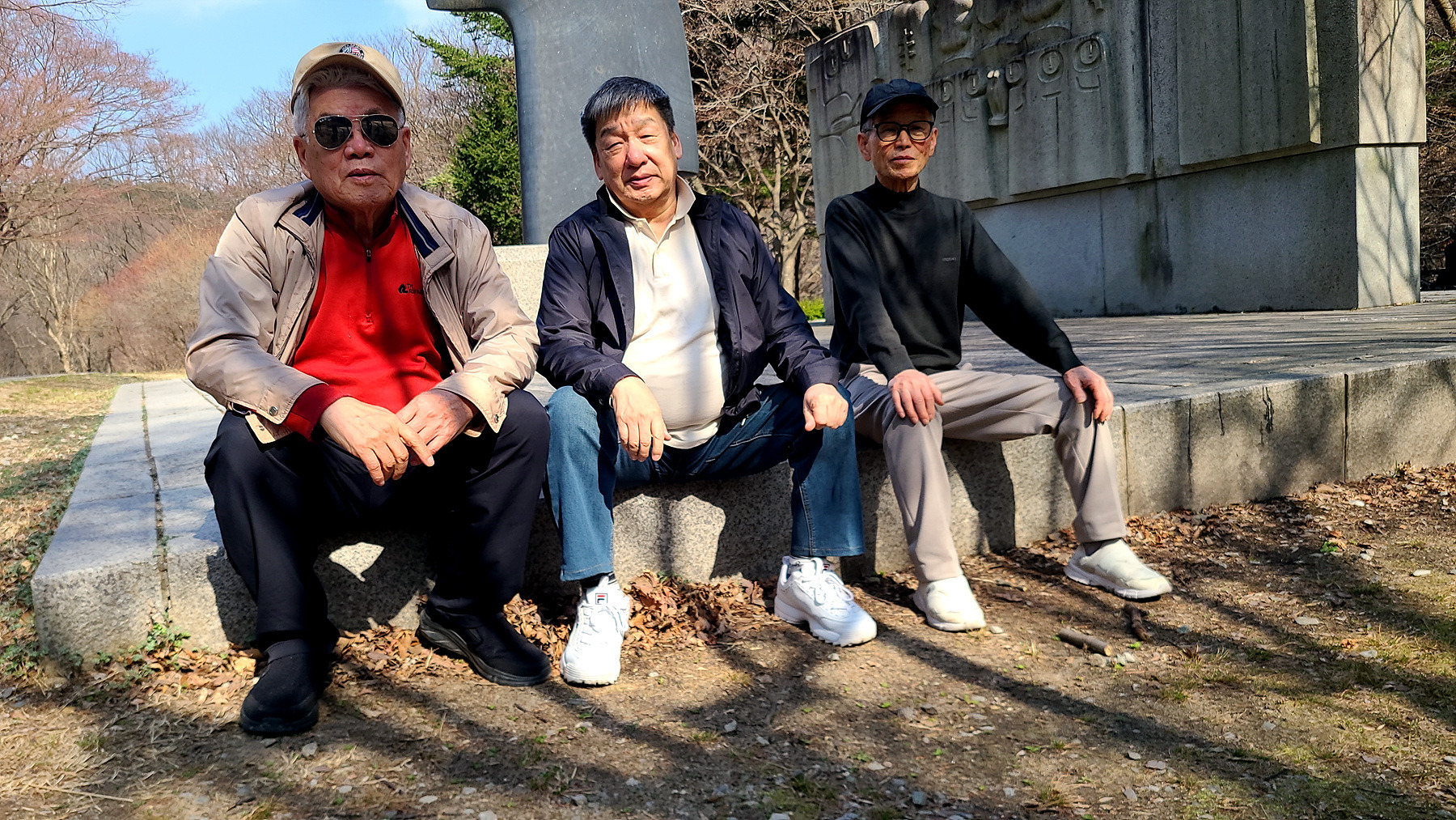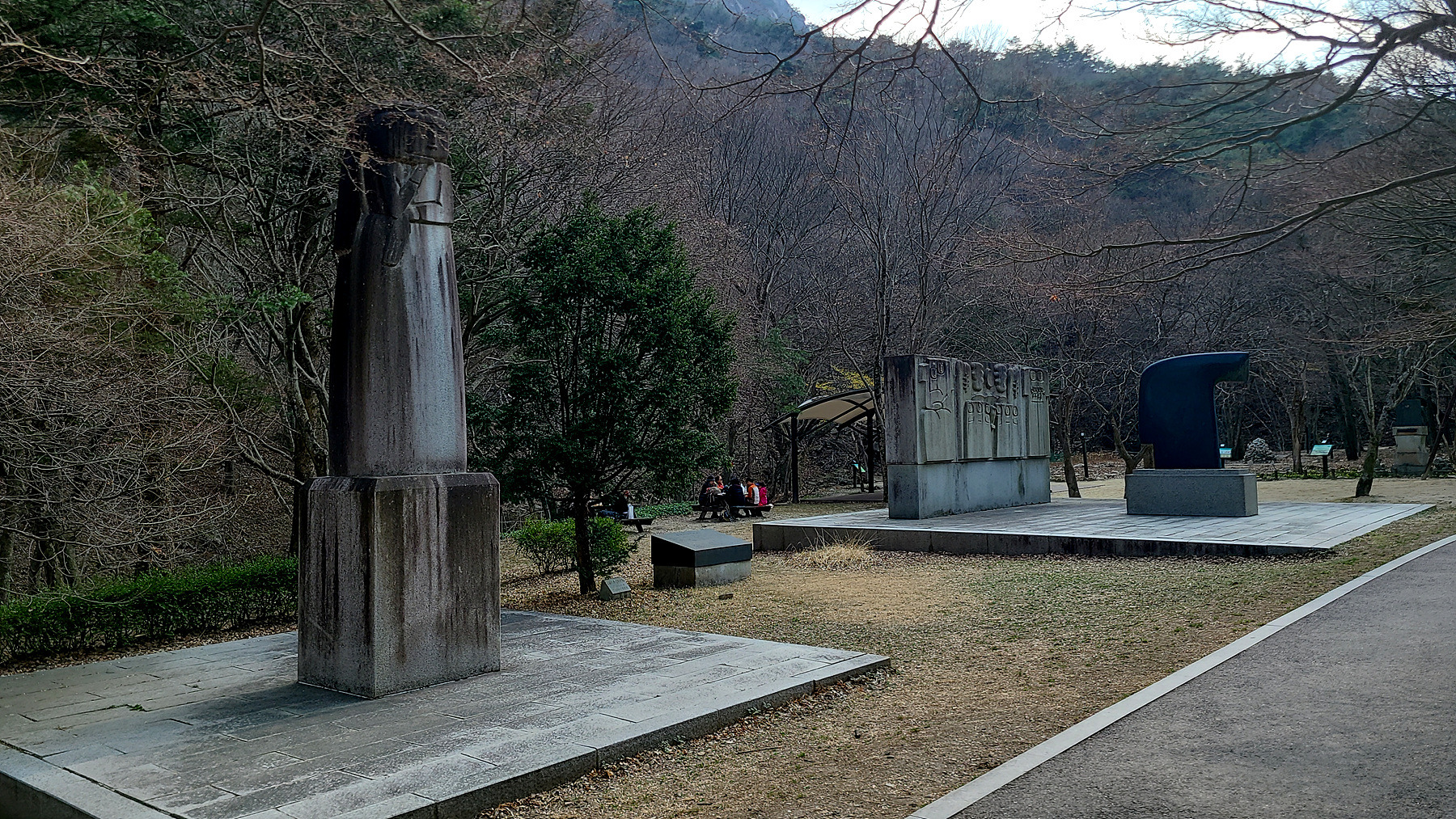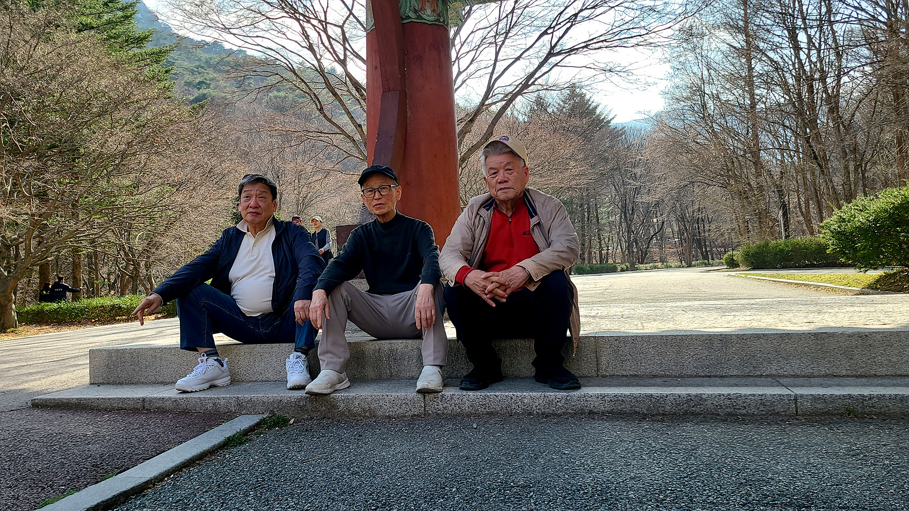 일주문 문턱(?) 과 부근의 석조형물 앞에서 잠시 머물며 휴식을 취하는 일행...