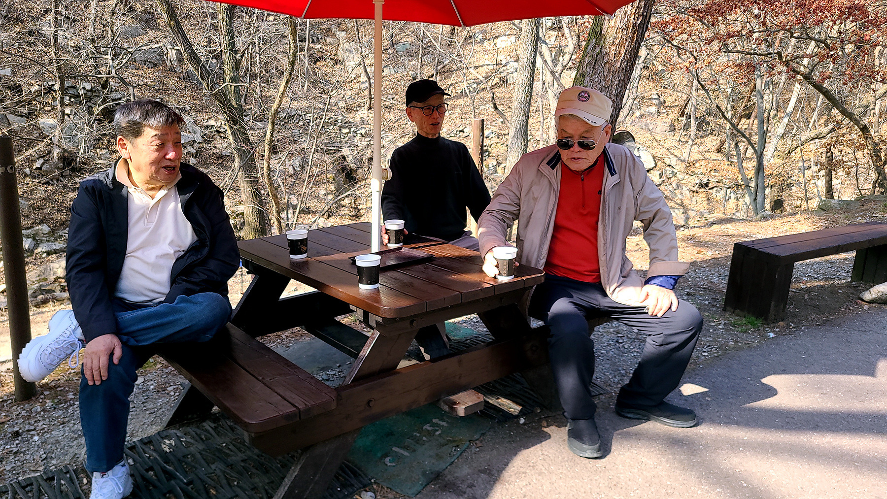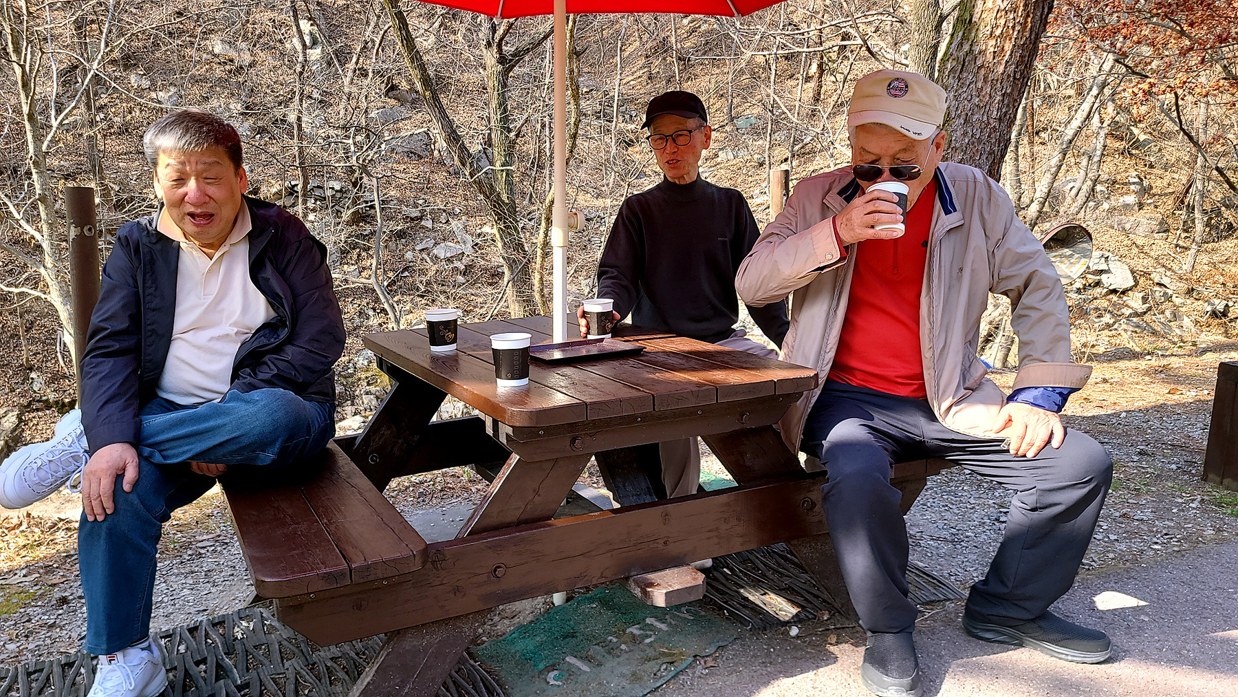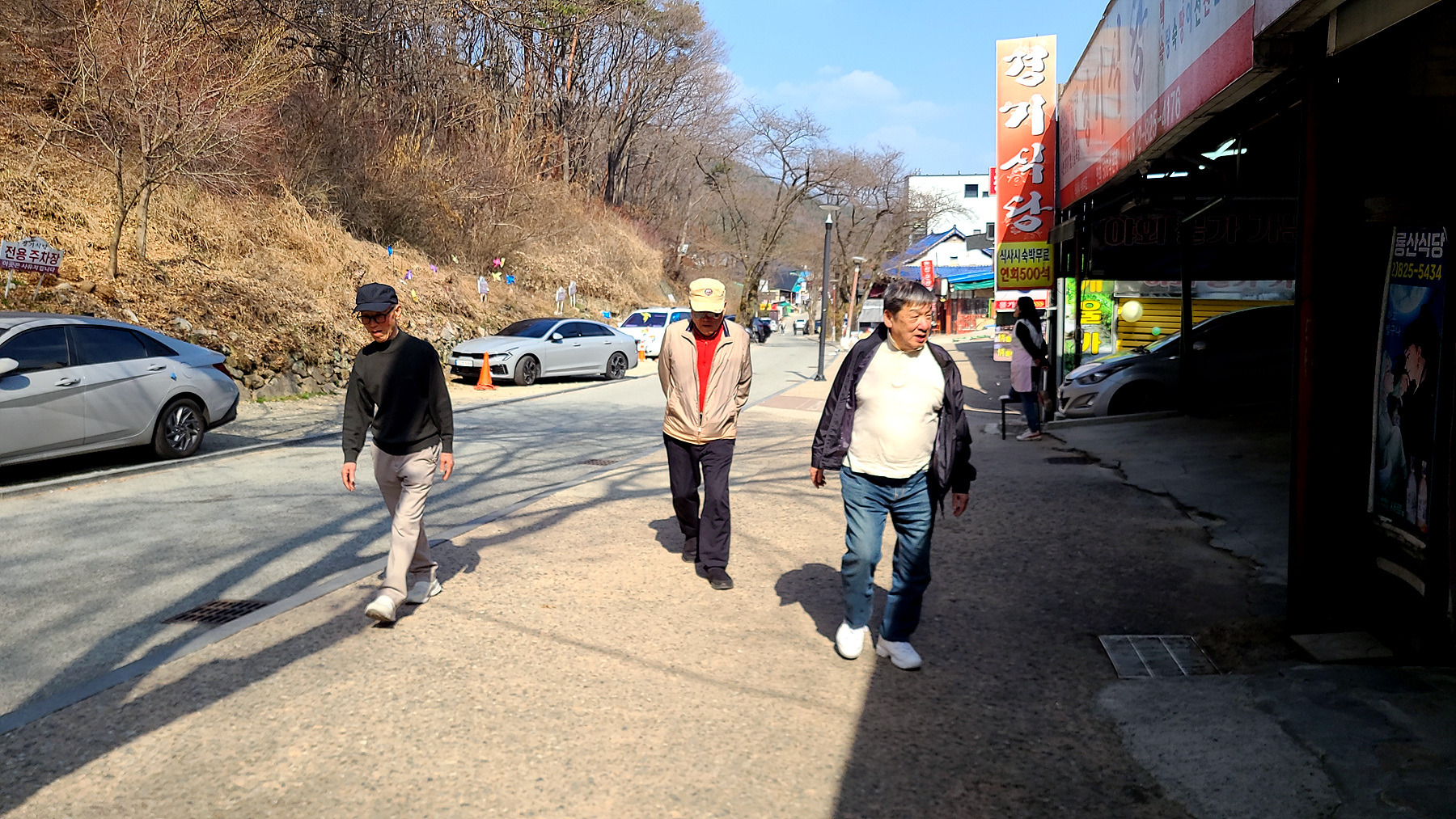 어쩔수 없는 노인네들... 동학사를 1.5km정도를 남겨두고 눌러 앉아 뭉게기로 합니다.