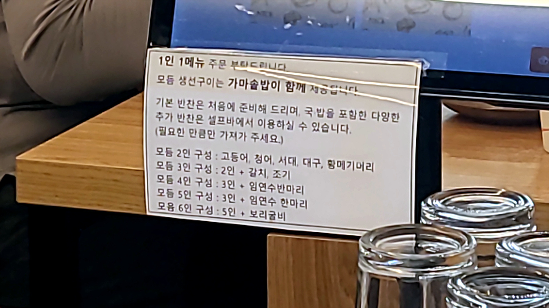 그림과 같이 식사 인원수의 규모에 걸맞는 식단표... 갖가지 생선구이가 군침을 돌게 합니다.