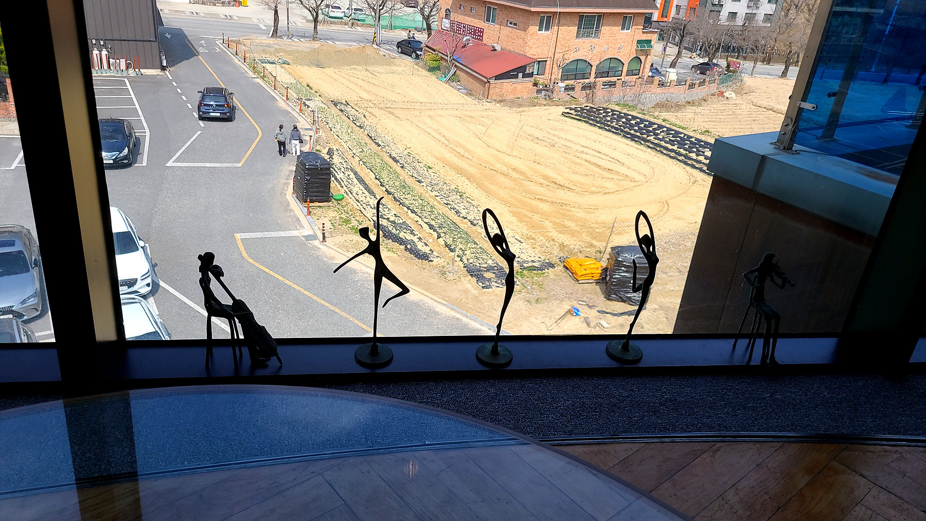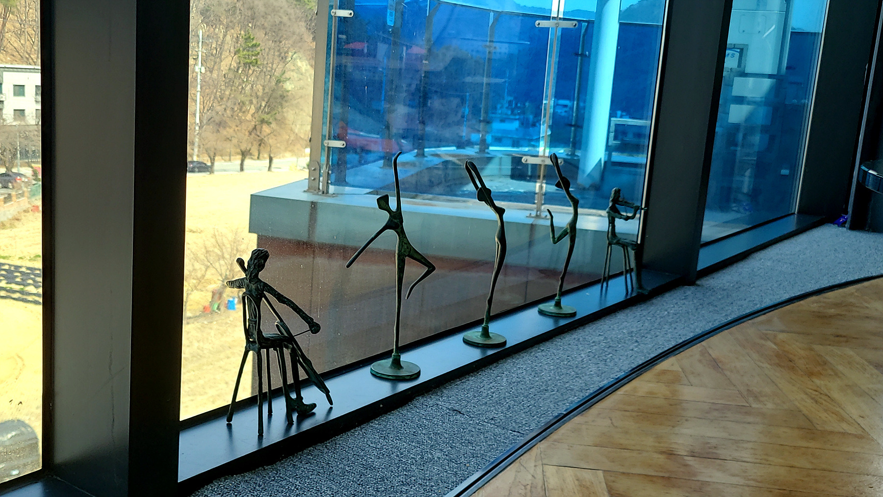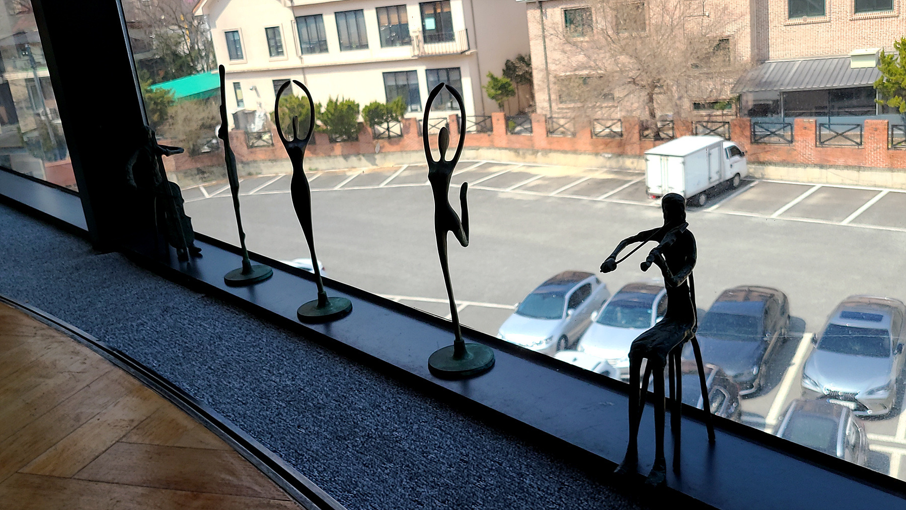 창가의 바이얼린과 첼로를 키는 인형과 춤추는 발레리나 인형의 모습이 무척 앙증스럽게 보는 가운데..