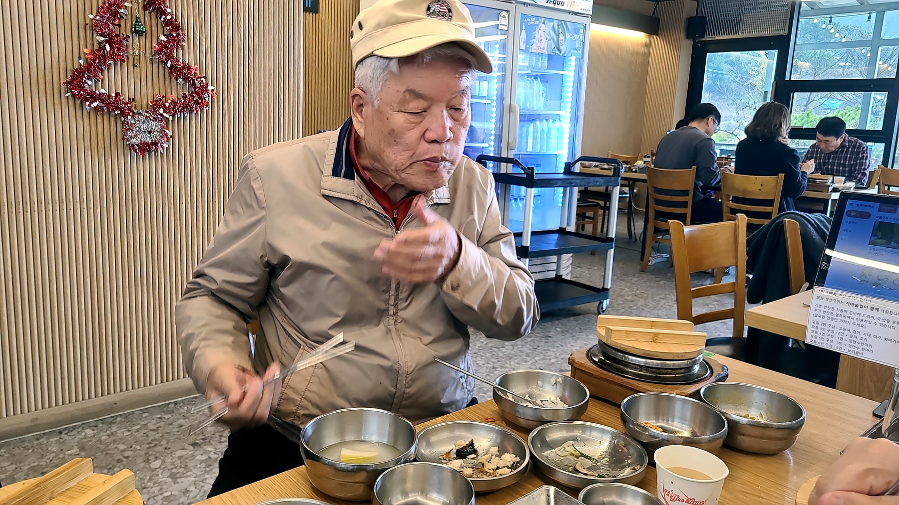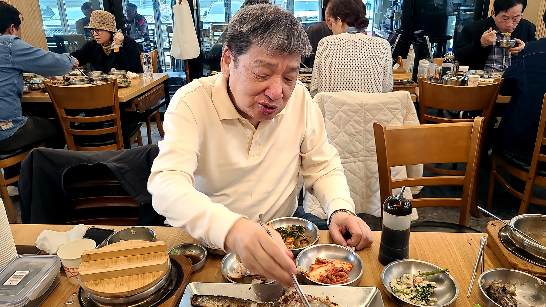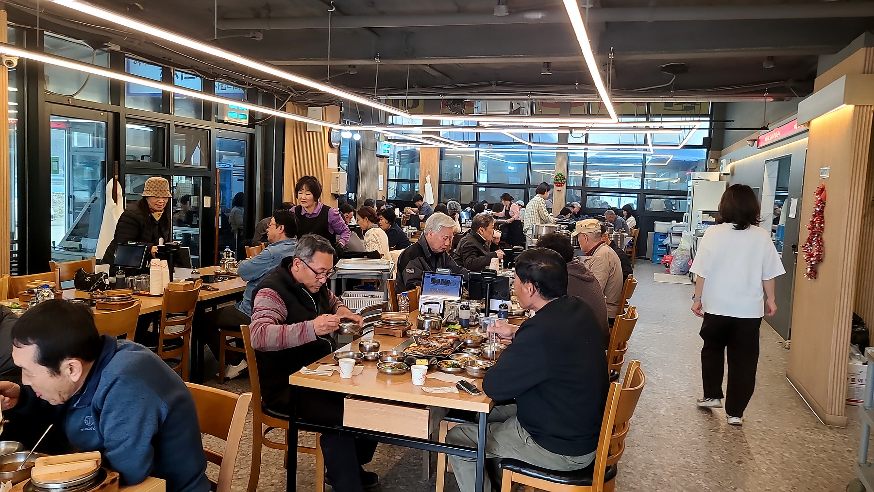조금 이른 점심시간인데도 식탁마다 좌정한 손님들과 주 메뉴 외에 푸짐한 뷔페식 밑반찬과 부식...
