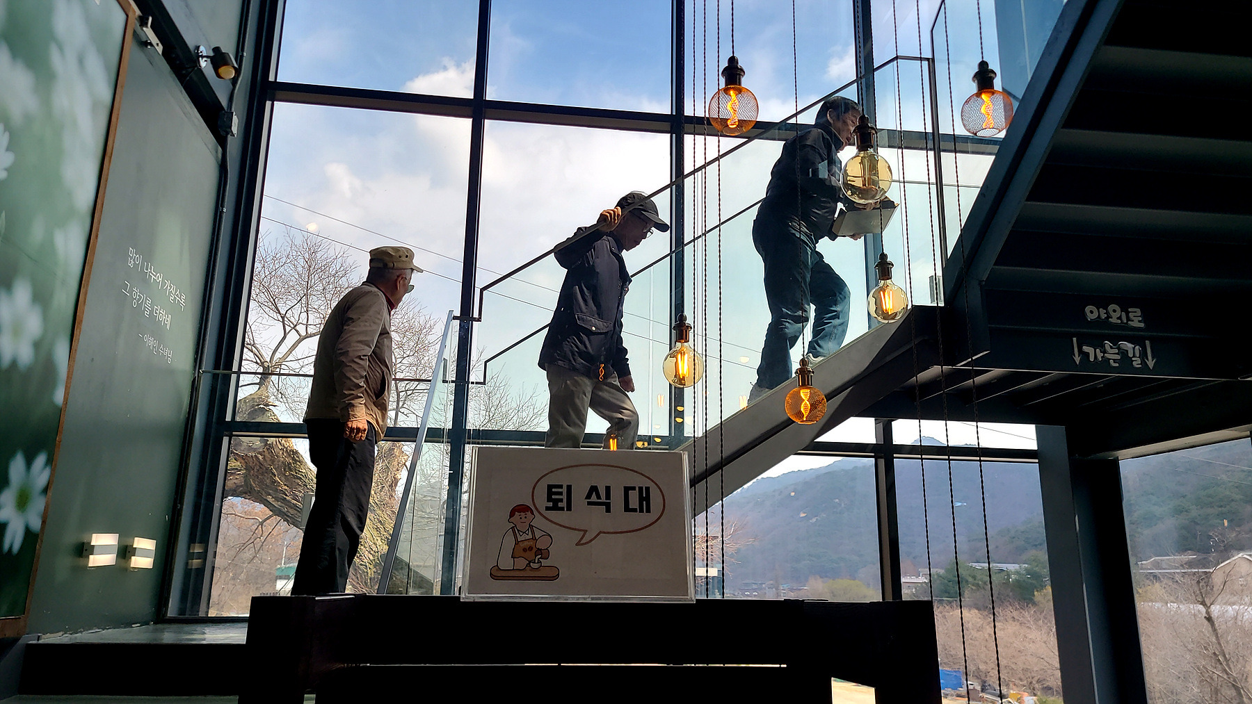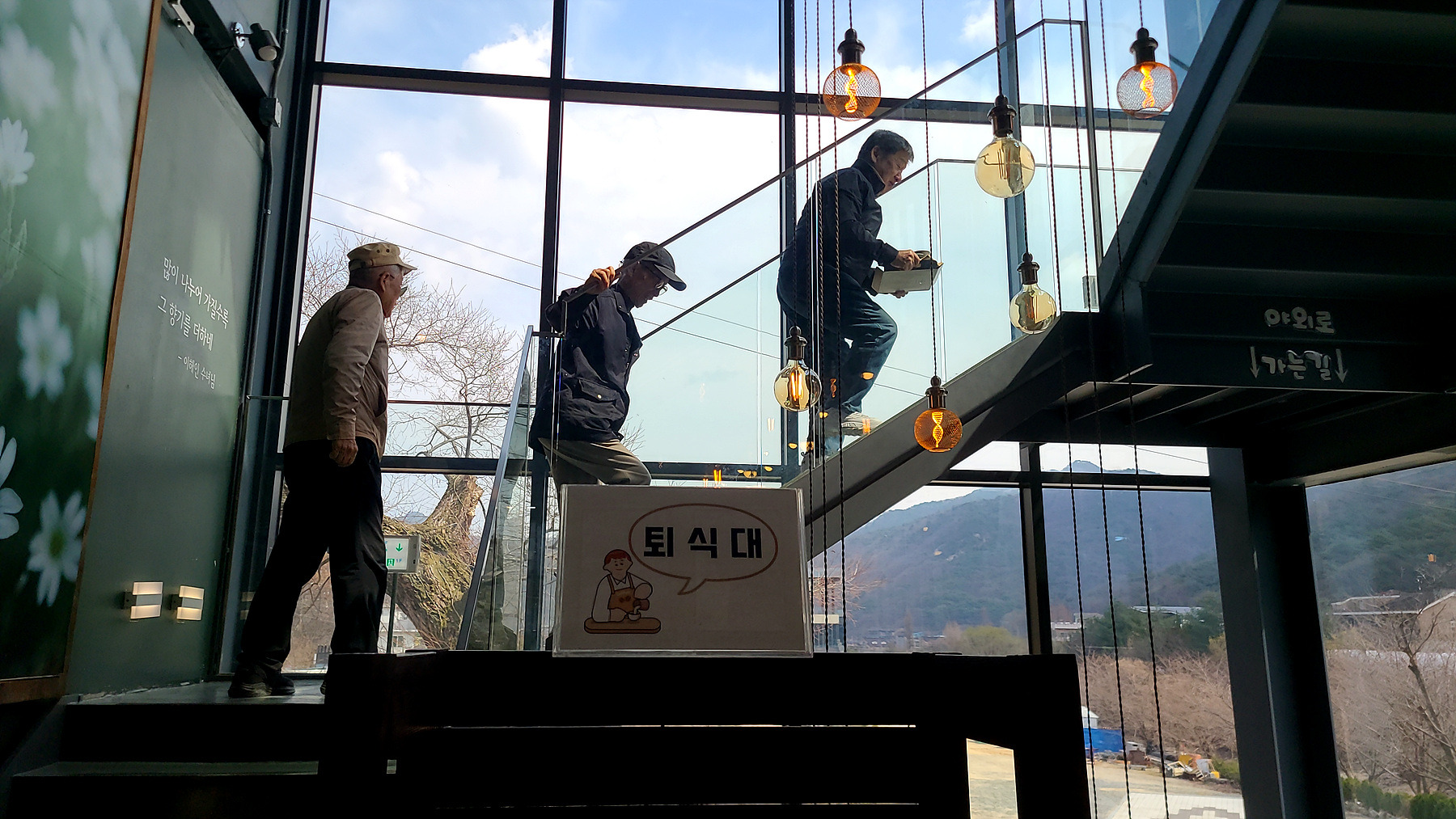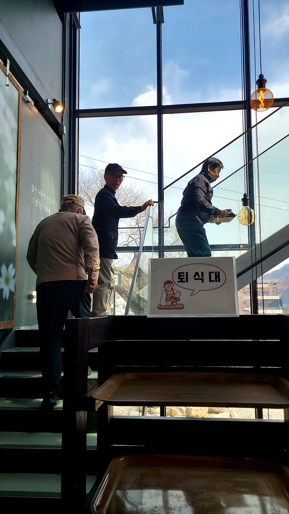 주문한 COFFEE를 들고 앞서거니 뒷서거니 계단을 오르는 장면..