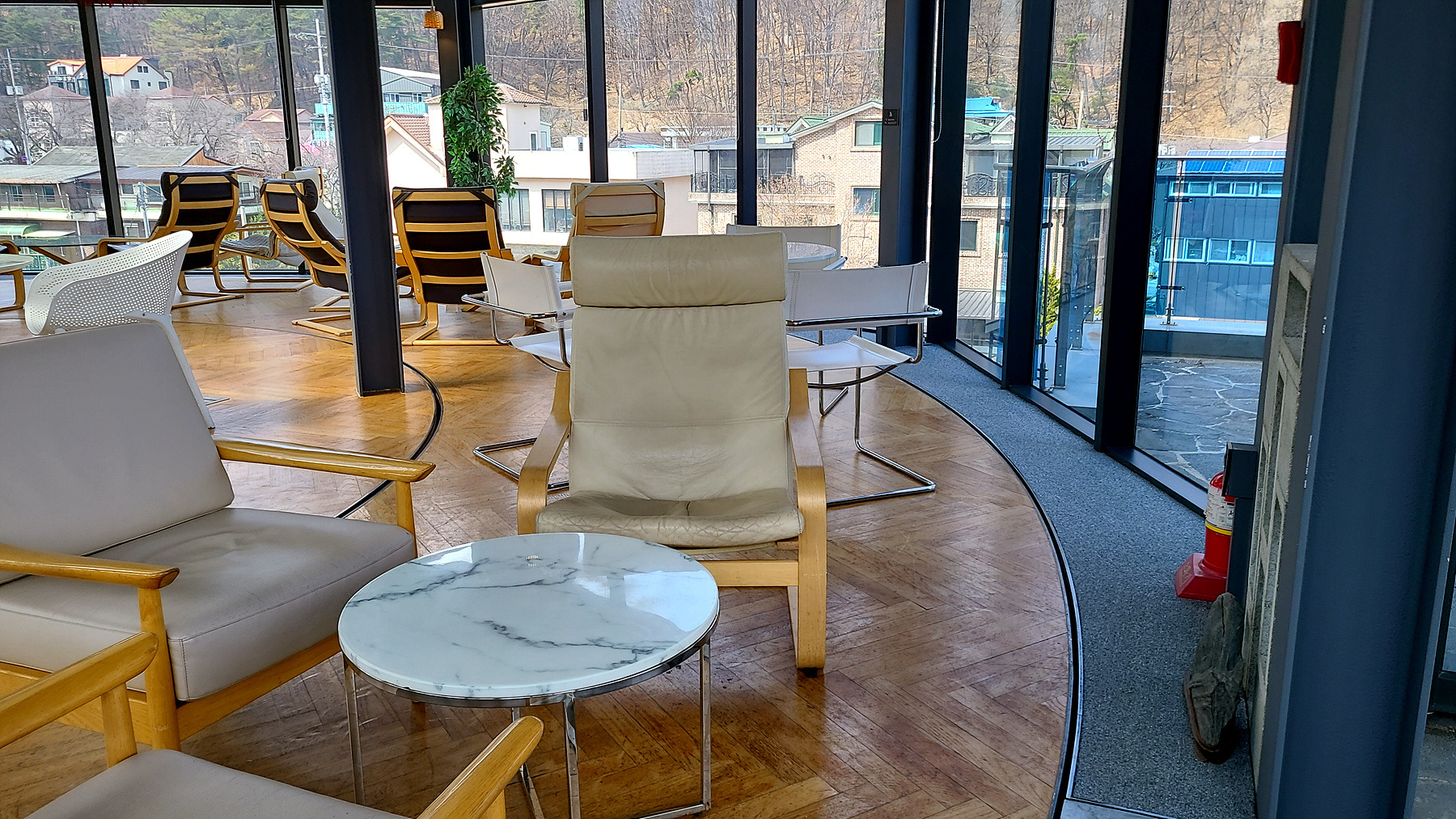넓다랏고 시원스런 2층과 앉은 사람이 의식 할 수 없는 속도로 회전하는 둥그런 3층의 모습..
