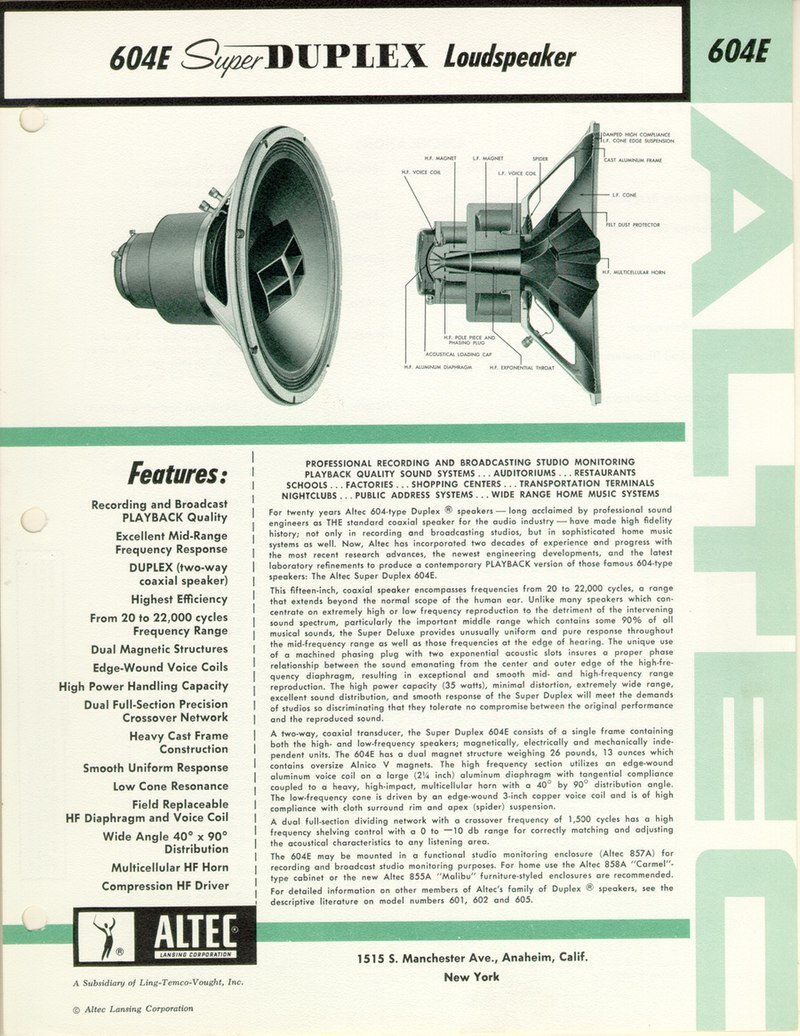 알텍 604 씨리즈 스피커는 1943년에 처음 DUPLEX SPEAKER를 개발하면서 탄생했는데 오늘날 까지도 세계 동축 스피커의 표준으로 군림합니다.