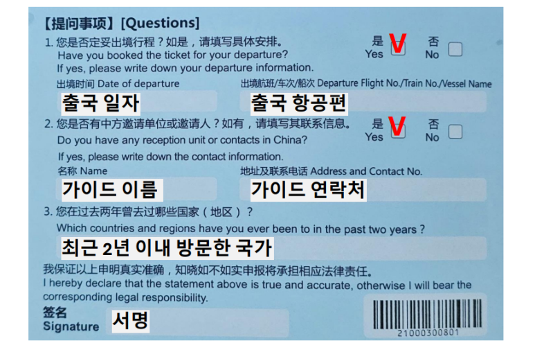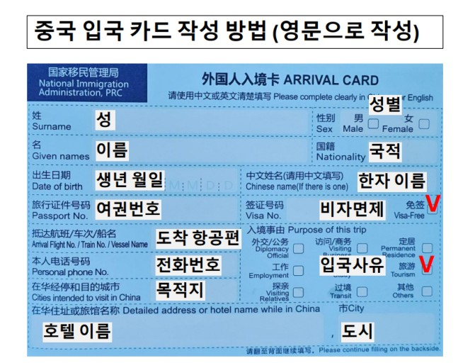 중국 입장시 단체 비자 면제시 외국인 입국 카드 작성