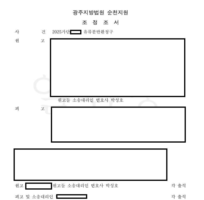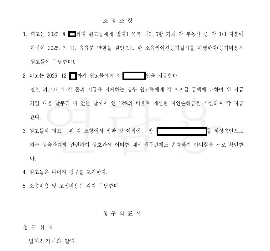 8. 그 결과, 의뢰인들과 상대방은 원만하게 합의를 하였고, 의뢰인들이 미리 준비한 합의안 제1번 내용대로 조정이 성립되었으며, 토지시가 상당액으로 환산하면 총 6억 상당의 유류분액을 반환받았습니다.