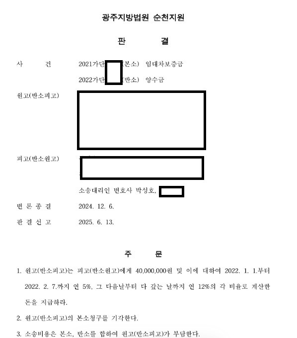 [민사] 순천변호사 - 본소 청구 5,000만원 전부 기각, 반대로 양수금 반소청구 4,000만원 인용된 전부 승소 성공사례