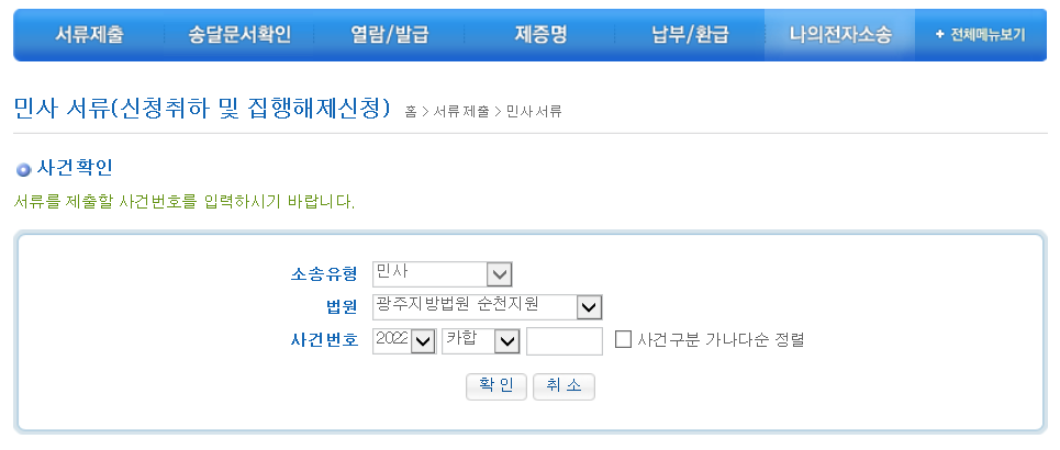 4. 아래에 링크된 전자소송 홈페이지에 로그인 후, 메인화면 상단의 '서류제출' → '민사서류' → '민사신청' → '신청취하 및 집행해제신청'을 선택합니다.