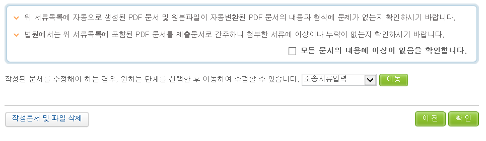 13. 신청서가 작성됐고, 첨부서류가 제대로 첨부되었는지 확인할 수 있습니다. 모든 내용에 이상이 없다면, '모든 문서의 내용에 이상이 없음을 확인합니다.' 란에 체크표시를 하고 '확인'버튼을 누릅니다.