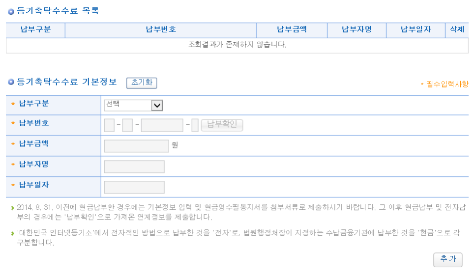 9. 등록면허세는 위택스(www.wetax.go.kr)에서, 등기신청수수료는 인터넷등기소(www.iros.go.kr)에서 납부 가능하고, 납부확인서도 출력 가능하며, 납부확인서에 기재된 등록세납부번호와 등기촉탁수수료 납부번호를 입력하면 됩니다.