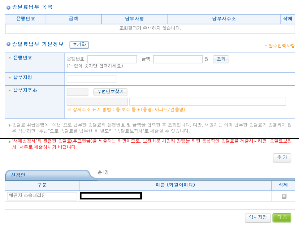11. 등록면허세와 등기촉탁수수료 외에 송달료 3회분(5,200원 × 3회분 = 15,600원)도 납부해야 하는데, 신청 전 미리 납부 후 송달료납부영수증에 기재된 은행번호와 금액, 납부자명, 납부자주소를 기재해야 합니다.