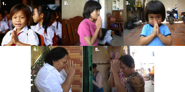 캄보디아 부모들은 아이들에게 어른이 무엇을 줄 때면 언제든 두 손을 모아서 '썸뻬아'를 한 후에 '어꾼'(감사합니다)라고 말하라고 가르친다. 실제로 우리가 아이들에게 사탕이라도 나누어 주면 '썸뻬아'로 답하는 아이들을 볼 수 있을 것이다.