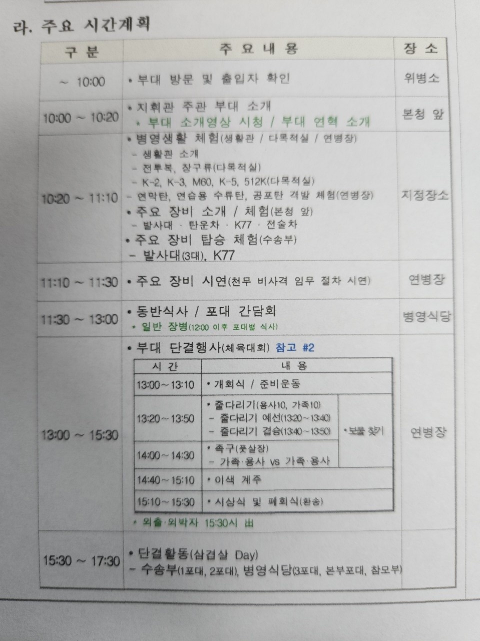 < 일정표 마지막의 삼겹살데이는 외박을 가지 못하는 부대후배장병들을 위한 부대측 행사로서