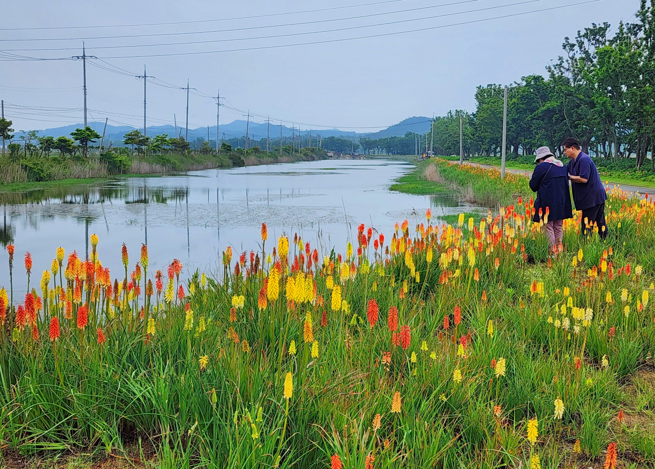▶수국축제를 빛내는 백댄서 니포피아, 금계국= 3.5㎞ 팽나무 가로수길 아래엔 수국과 금계국, 패랭이 꽃들이 자라고, 옆강에는 튤립과 사루비아를 섞어놓은 듯한 니포피아 군락이 섬을 화사하게 빛낸다.