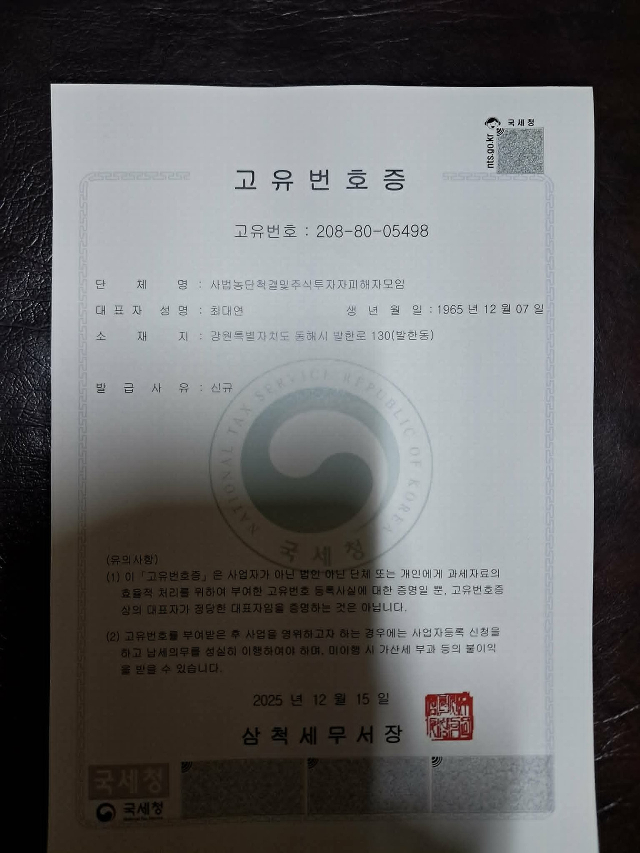 최대연 대표및 법무팀 수석 회장)으로 비영리 시민 단체 등록증 받았음)