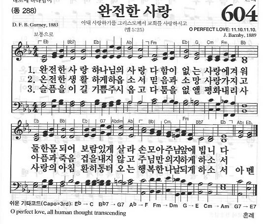 작사 : 가장 훌륭하고 인상적인 이 혼례 찬송가는 도로디 블룸필드 거니(Dorothy Frances Blomfield Gurney, 1858-1932)가 그녀 언니의 결혼식을 위해 지은 그녀의 유일한 찬송시이다. 1883년 어느 주일 저녁 블룸필드 가족들은 피아노에 둘러서서 찬송가를 부르고 있었다. 결혼식에 부를 "힘과 억제"라는 찬송가도 불렀는데 식구들은 그 찬송가 가사가 결혼식에 적절하지 못하다고 말하자 도로시의 언니는 그녀에게 새로운 가사를 부탁하였다. 도르시는 바로 서재로 가서 단 15분 만에 이 "완전한 사랑" 이라는 찬송시를 지어가지고 돌아왔다. 그들은 모두 이것을 <힘과 억제>의 곡에 맞추어 불렀다. 그녀의 언니는 그 찬송시를 결혼식 때 꼭 불러야겠다고 말하면서 크게 기뻐하였다. 2 ~ 3년 동안 이 찬송시는 많은 결혼식장에서 불려졌고 그 후 찬송가에 수록되었다.