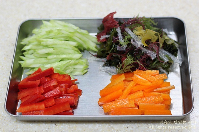 물기 짠 해초와 함께 파프리카와 오이는 채 썰고...