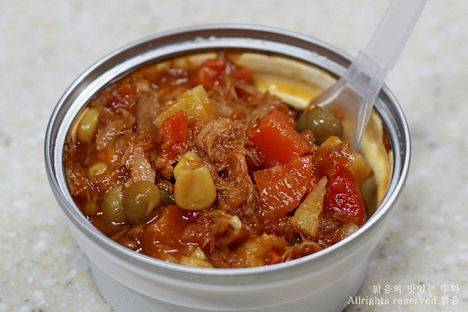 참치와 함께 완두콩, 옥수수, 당근, 양파, 피망 등이 토마토소스와 어우러져