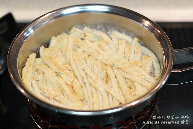 채 썬 어묵은 끓는물에 데쳐 기름기를 빼주고...