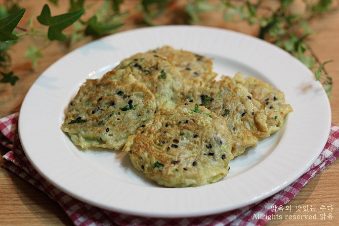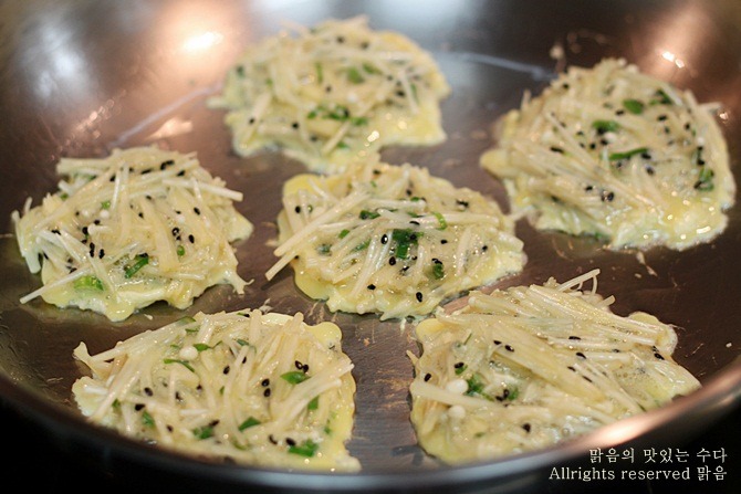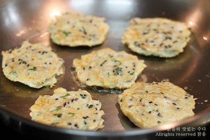 달궈진 팬에 기름 두르고 한숟가락씩 떠서 앞뒤로 노릇하게 구워주면...