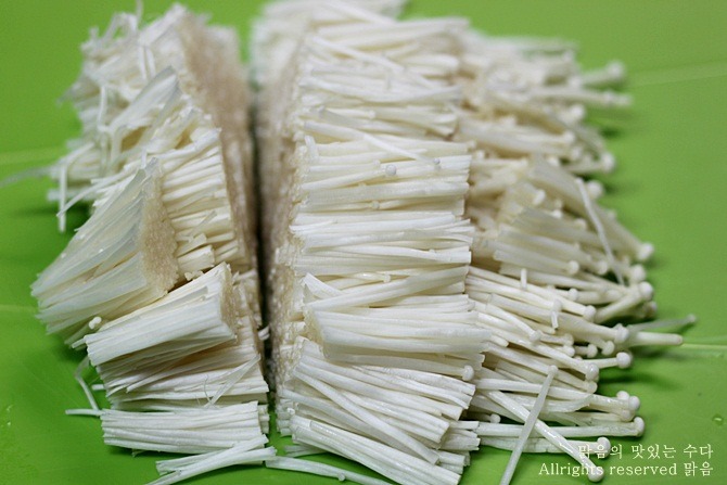 팽이버섯은 봉지째로 밑동을 자르고 흐르는 물에 살짝 헹군후 물기 털어 3등분 해주었어요.