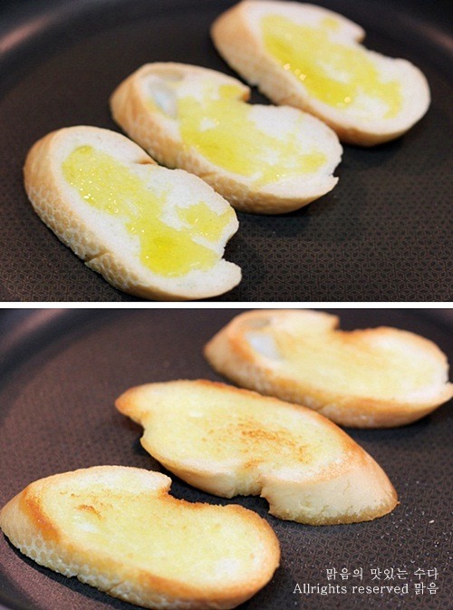 바게트에 올리브오일 듬뿍 뿌려 앞뒤로 노릇노릇하게 굽기!!