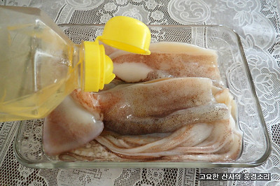 ㉢ 내장을 뺀 오징어를 잘 씻어 물기를 제거하고 껍질 부분이 쟁반 쪽으로 가도록 해서 식초를 잘 묻힌 후