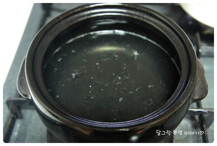 뚝배기에 멸치육수나 생수를 넣고 팔팔 끓이다가,