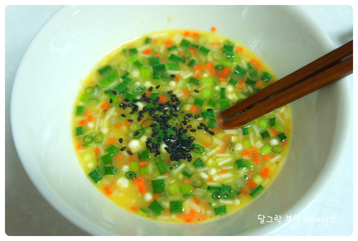 계란 푼 물에 다진 야채, 후추와 맛술을 넣고 잘 섞어준 다음,