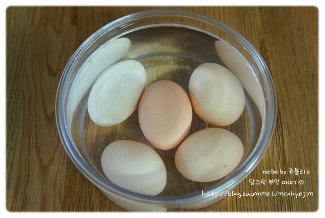 1. 달걀은 실온에서 30분 정도 꺼내둔 다음 미지근하게 만들어요.