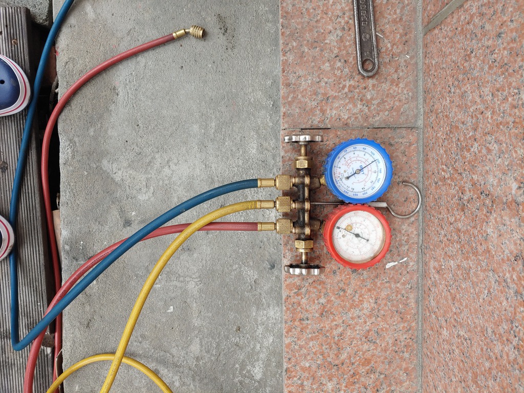 노란호스는 냉매에 연결 파랑색 호스는 실외기 저압부연결