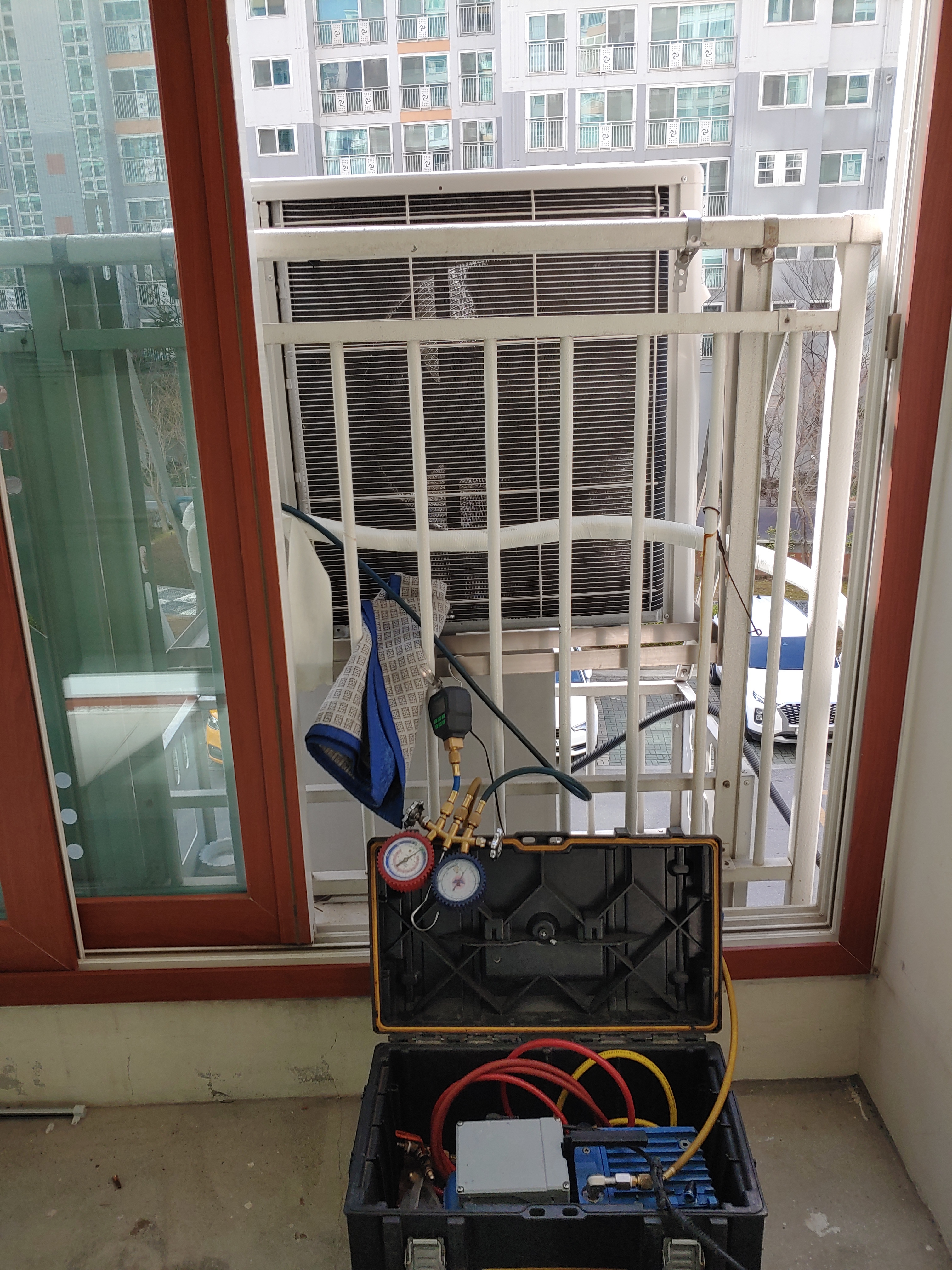 다음날 오전 일찍 방문 후 냉매 모으기 시운전 작업 중