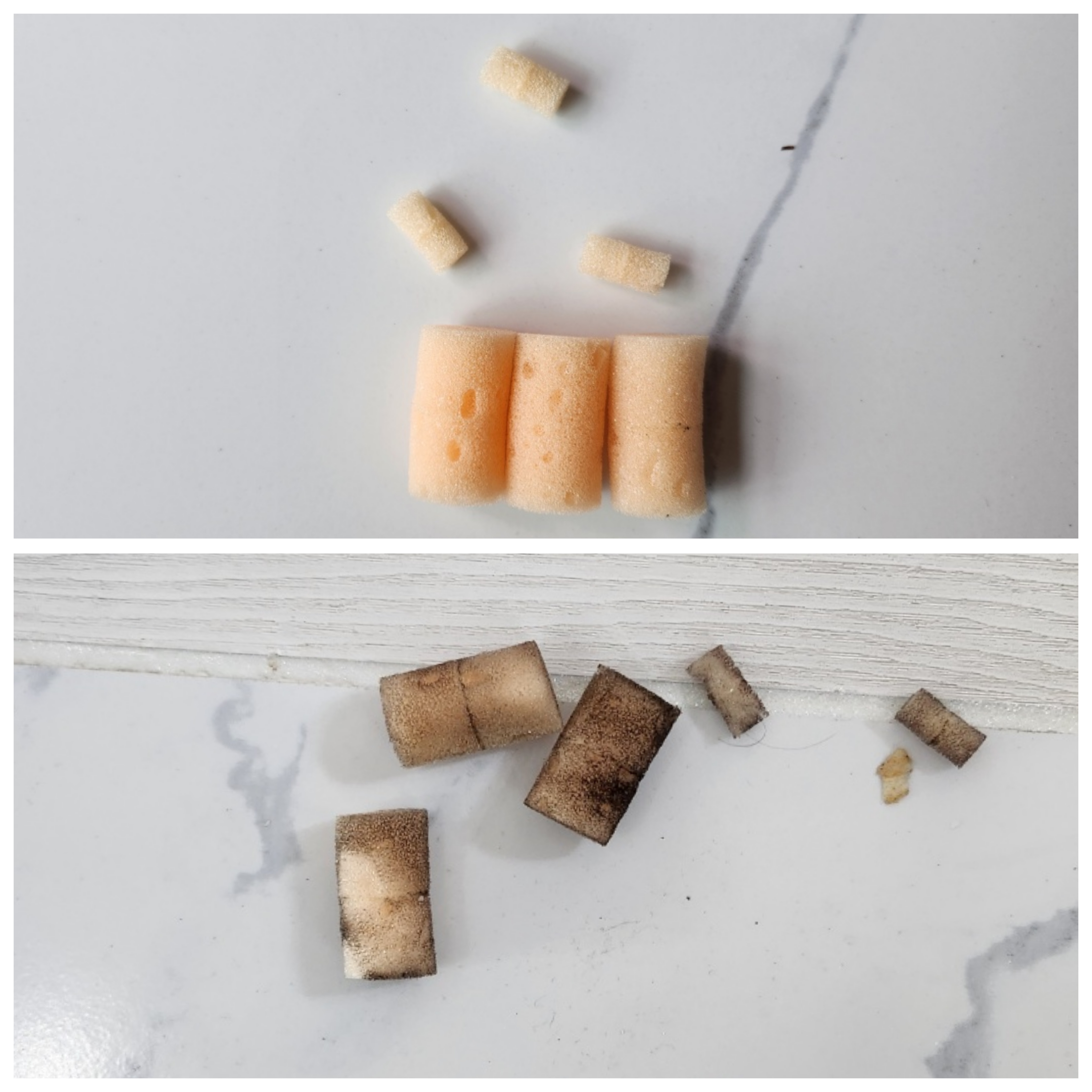 아래) 배관 청소에 사용된 스펀지 볼(이물/오일/타르 등 제거)