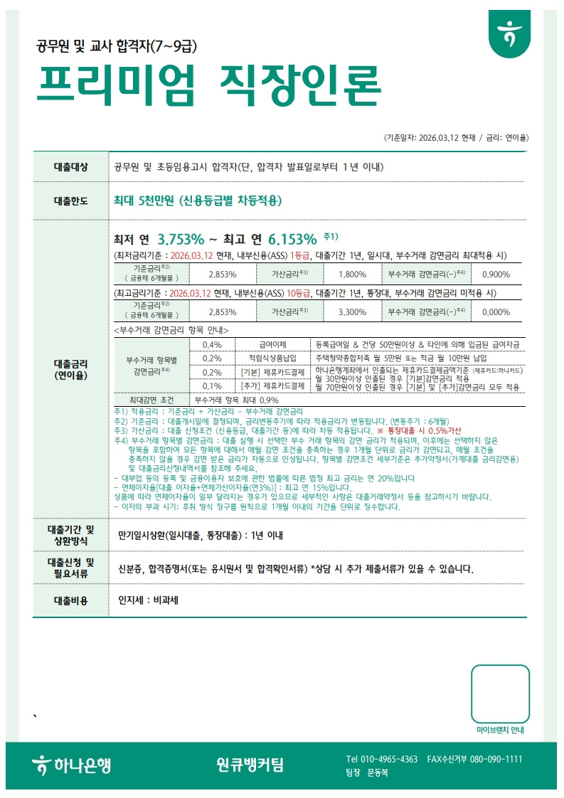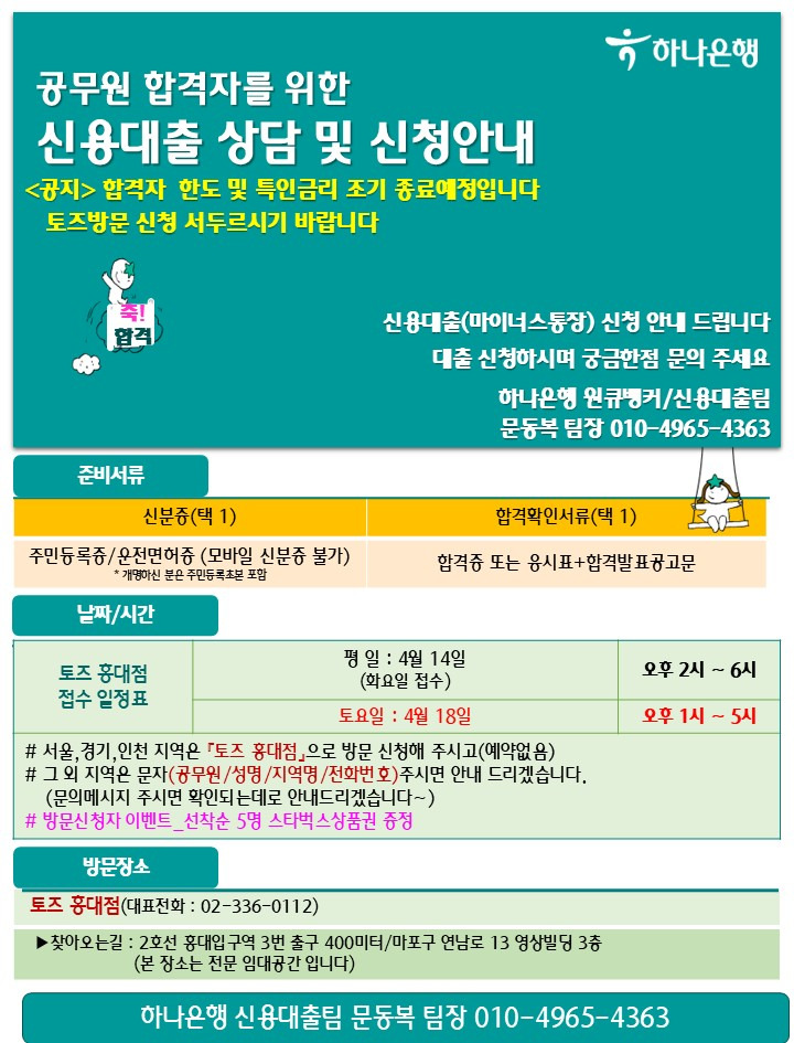 [하나은행]2026년 국가직지역인재 7급공무원합격자 신용대출(마통)신청안내(4/14, 4/18 - 화,토) 지방_문자신청 작성자하나은행|작성시간26.04.11|조회수10 목록 댓글 0 글자크기 작게가 글자크기 크게가 다음검색 현재 게시글 추가 기능 열기 북마크 공유하기 신고 센터로 신고 댓글 댓글 0 댓글쓰기 답글쓰기 댓글 리스트