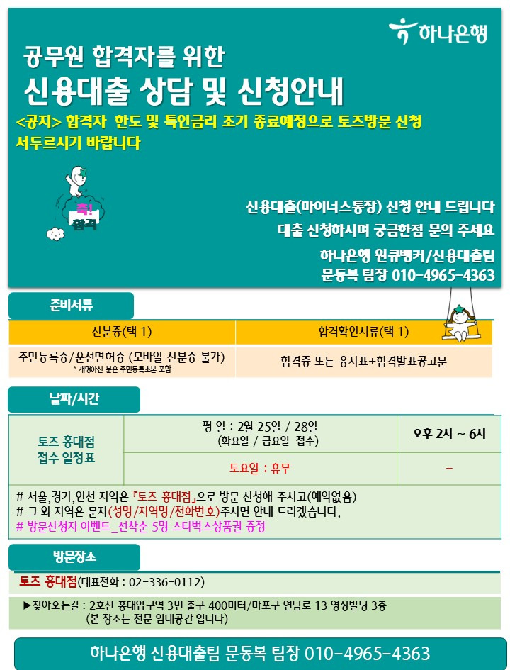 [하나은행]국가직지역인재 7급공무원합격자 신용대출(마통)신청안내(2/25,2/28 - 화,금) 지방_비댓,문자신청 작성자하나은행|작성시간25.02.22|조회수92 목록 댓글 0 글자크기 작게가 글자크기 크게가 다음검색 현재 게시글 추가 기능 열기 북마크 공유하기 신고 센터로 신고 댓글 댓글 0 댓글쓰기 답글쓰기 댓글 리스트