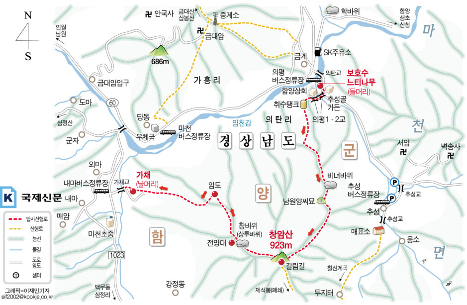 B팀: 마천면의평2교- 의탄마을- 취수탱크- 임도- 비녀바위- 남원양씨묘- 창암산- 상투바위- 가채마을(7k)4시간