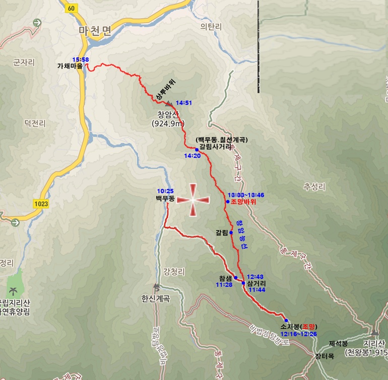 A팀: 백무동- 하동바위- 참샘- 삼거리- 아랫소지봉(1317)왕복- 창암능선- 갈림길사거리- 창암산(924)- 상투바위(창바위)- 가채마을(12.5K)5시간30분