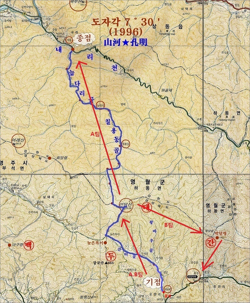 Ⓐ팀 =▶생달마을-늦은목이-선달산( 1236m)-외씨버선길-칠용동계곡-늪다리-내리천-내리솔밭캠핑장(17km.7시간)