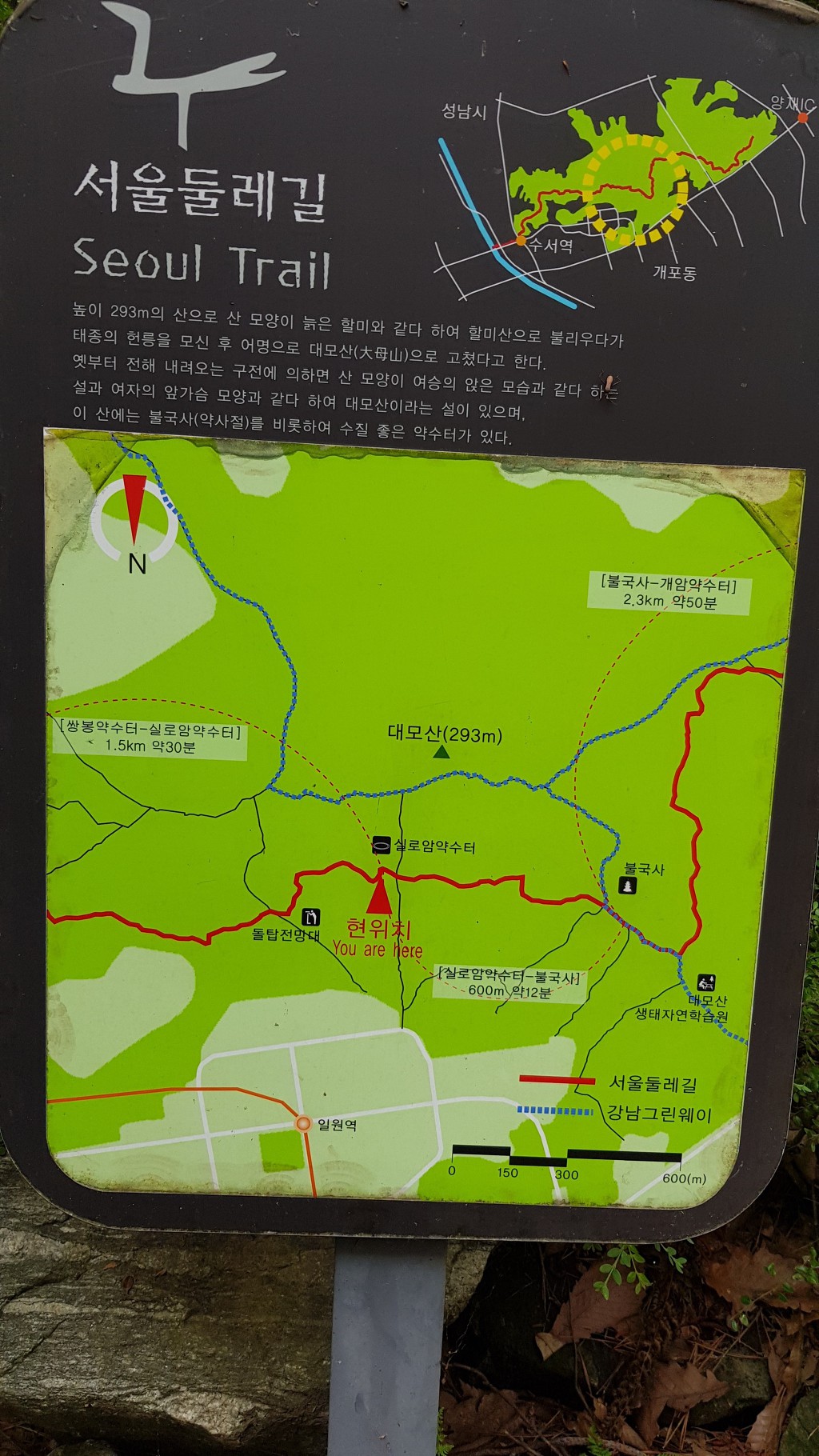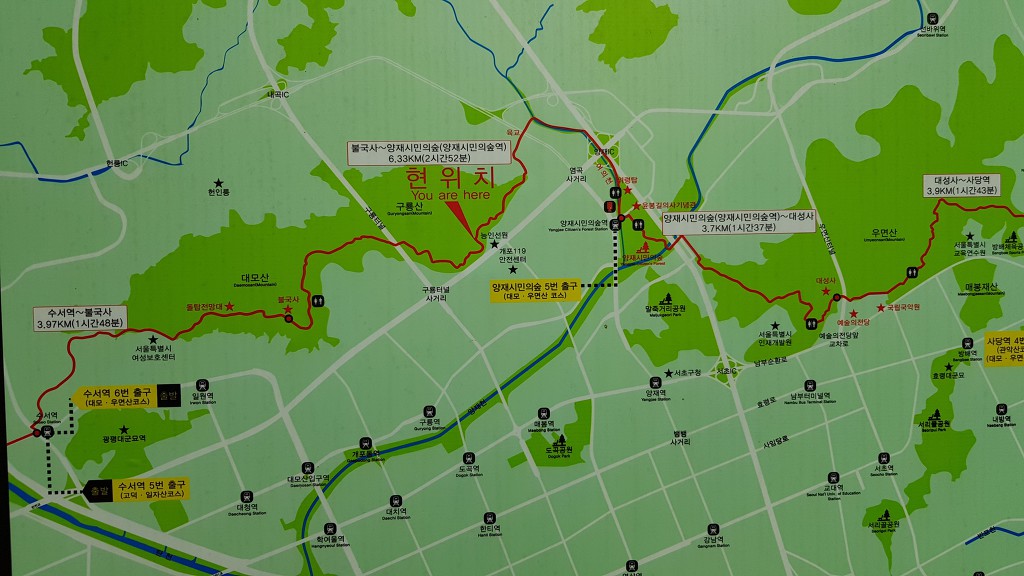 금번의 걷기운동은 일원역에서 로봇고교를 지나 불국사쪽으로 가야 하는데, 들머리를 잘못 선택, 대모산의 일부지역(돌탑전망대~실로암약수터)을 거쳐서 불국사를 지나 구룡산둘레길을 걷고, '양제시민의숲역' 까지를 걷고, 그곳에서 남부터미널역으로 이동하여 점심식사(뒤풀이)를 같이 하였다.