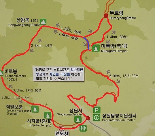 산행3코스=상원사-사자암-적멸보궁-비로봉-상왕봉 왕복(3시간30분)