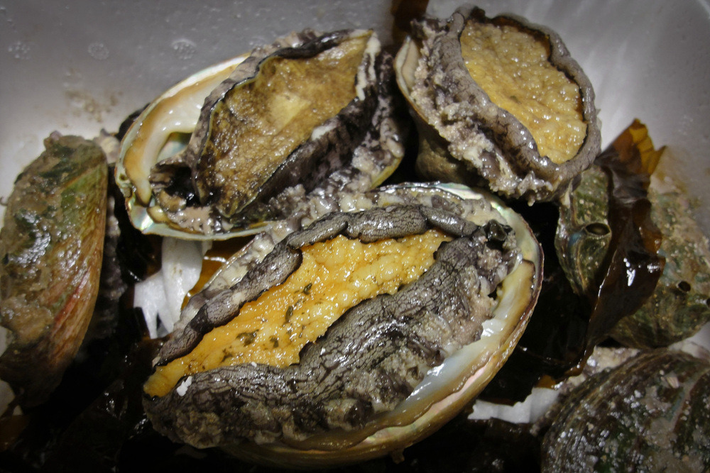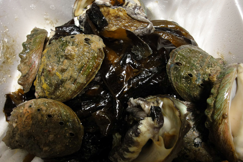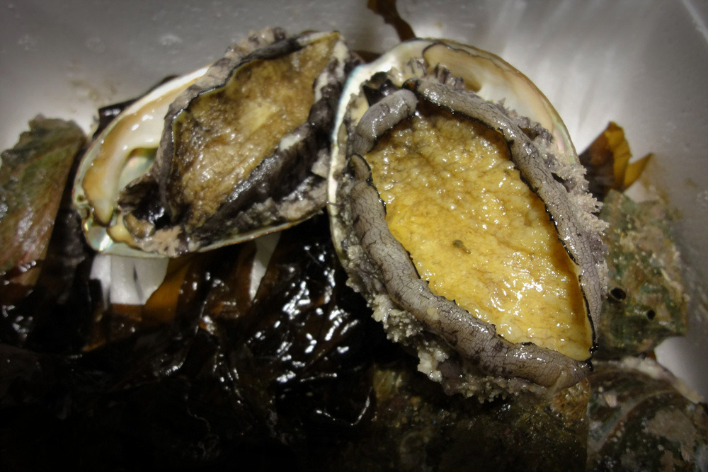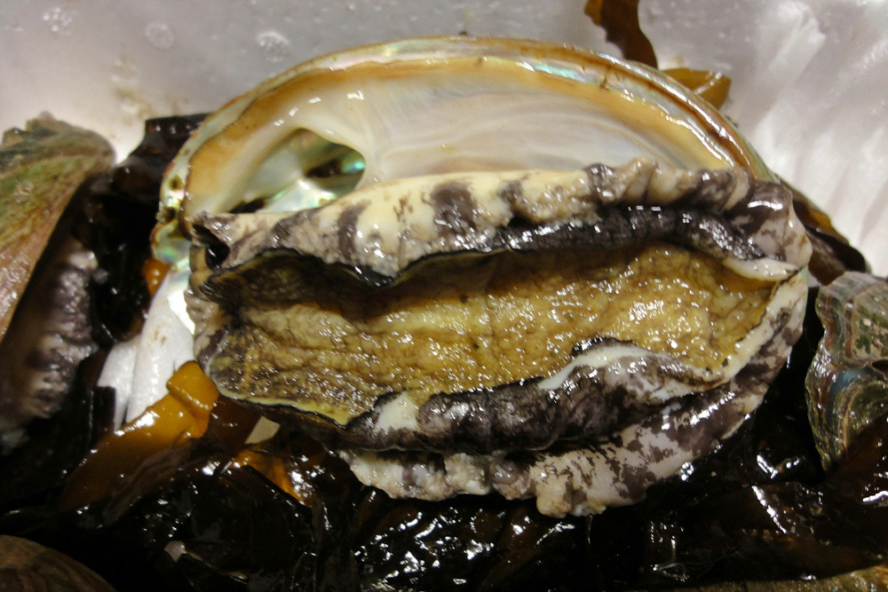 살아 있는 전복이다, 스티로폼 박스에 얼음팩과 미역과 함께 포장하여 전국으로 배달하면 서울에서도 이와같이 싱싱한 전복을 받아 볼 수 있다
