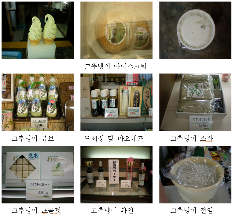 우리나라와 일본에서는 생선회나 생선초밥과 함께 섭취하는 것이 일반화되어 있다. 특히, 일본의 경우 줄기를 이용한 여러 가공식품(차, 소시지, 아이스크림, 마요네즈, 비스킷, 된장 등)이 개발되어 판매되고 있다. 현재까지 고추냉이의 각종 유효 효능성에 대한 연구가 많이 보고되어 왔기 때문에 앞으로 이들 소재 에 대한 수요가 급증할 것으로 예상된다. 그러나 고추냉이 추출물의 주요 성분 인 AIT는 항균력은 강하나 휘발성이기 때문에 그 효능의 지속성이 떨어지며 특정 포장상태에서 그 효력을 나타내는 단점을 갖고 있다.