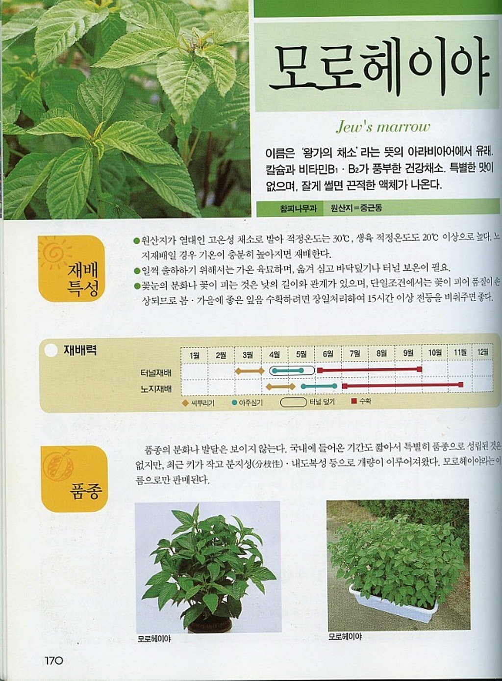 장삭황마[長蒴黃麻: 원강합니족약(元江哈尼族藥)=광서약용식물명록(廣西藥用植物名錄)], Moroheiya[아프리카명], Corchorus olitorius L.[학명], Jew's marrow, tossa jute[영명], mulukhi-yya, 무루헤이야, 무루키이[이집트명], 모로헤이야, 몰로키아, 대만황마, 섬황마 등으로 부른다. 중국에서 펴낸 <중국본초도록(中國本草圖錄)>에서는 이렇게 모로헤이야 대해서 기록하고 있다. [장삭황마(長蒴黃麻) 기원: 단수과(椴樹科=피나무과=Tiliaceae)식물인 장삭황마(長蒴黃麻=Corchorus olitorius L.)의 뿌리와 잎이다. 형태: 초본 또는 아관목으로 줄기에는 털이 없다. 잎은 단엽(單葉)으로 어긋나며 난형(卵形) 또는 난상 피침형(卵狀 披針形)이고 가장자리에는 거치(鋸齒)가 있고 털이 없으며 엽저 양측에는 꼬리모양의 작은 열편(裂片)이 있고, 잎자루에는 털이 있으며, 탁엽(托葉)은 선형(線形)이다. 꽃은 황색(黃色)이고 액생(腋生)하거나 액외생(腋外生), 단생(單生)하거나 취산화서(聚傘花序)에 달리고, 꽃받침잎은 4∼5장이며, 꽃잎도 4∼5장이고, 수술은 여러개가 분리되어 있다. 삭과(蒴果)는 장원주형(長圓柱形)이며 길이는 3∼8mm이고 털이 없으며 10개의 능각이 있고 날개는 없으며 정단에 1개의 부리가 있고 5조각으로 갈라진다. 분포: 광야의 초지나 밭가에서 자란다. 중국의 화동(華東), 화남(華南), 화중(華中), 서남(西南)에 분포. 채취 및 제법: 여름과 가을철에 채취하여 햇볕에 말린다. 성분: 뿌리 및 줄기: r-내지치족화합물(內酯甾族化合物: r-lactone steroid) 등이 들어 있다. 효능: 뿌리-발한해표(發汗解表). 잎-강심(强心). 주치: 풍한감모(風寒感冒) 용량: 하루 20g을 물로 달여서 복용한다. 참고문헌: 원강합니족약(元江哈尼族藥) 166면; 광서약용식물명록(廣西藥用植物名錄) 173면; C.A. 91면(1979), 120354u.] 모로헤이야에 대해서 일본에서 펴낸 <건강·영양식품사전>에서는 다음과 같이 기술하고 있다. [모로헤이야 높은 영양가로 허약체질을 개선, 피로를 회복 중·근동이나 아프리카를 주산지로 하는 참피나무과에 속하는 일년초. 이집트에서는 옛날부터 어린줄기나 잎을 뜯어서 식용해 왔다. 일본에서도 최근, 건강야채로 눈을 돌리는 기운속에서 주목을 모으며, 오키나와 등에서 재배되게 되었다. 다소 미끈거림이 있어서 약간 씁쓸한 맛이 나지만, 어린싹은 부드럽고 특유의 냄새가 없으므로, 생잎 그대로도 먹을 수 있으며, 그밖에 데치거나 무침음식, 샐러드, 식초를 친 요리에도 잘 맞으며, 된장국의 재료나 수프에도 적합하다. 게다가 튀김으로 해도 맛있을 뿐만 아니라, 당근을 상회하는 카로틴을 유효하게 섭취하기 위해서는 기름을 사용한 조리가 최선이다. 그 영양가를 보면, 식용부분 100g중(괄호안은 당근의 경우), 칼슘 260(28)g, 인 110(25)mg, 철 1(0.2)mg, 칼륨 530(280)mg, 카로틴 10000(9100)㎍, 비타민 B1 0.18(0.05)mg, B2 0.42(0.04)mg, C 65(4)mg으로 모두 야채류에서는 가장 압도적인 숫자를 보여준다.] [모로헤이야 먹는 방법과 효능] 제철은 여름. 하나하나의 잎이 잘 붙어 있고 광택이 있으면서 부드러운 것을 택한다. 떫은맛은 없지만 썰면 참마나 오크라와 같은 점액이 나온다. 일반 식료품점보다 큰 슈퍼마켓이나 자연식품점등에 많이 출하된다. 다른 엽채류와 같은 요리를 할 수 있다. 데쳐서 무치거나 삶아 국을 만든다. 또 생으로 튀겨도 좋다. 특유의 점액이 있으므로 오크라와 같이 칼로 잘라 점액을 빼고 간장을 끼얹기만 해도 맛이 좋다. 건강에 좋은 채로로 화제가 될 만큼 영양면에서 우수한 특징을 가지고 있다. 시금치와 비교하면 철분과 비타민 C에서만 약간 밑돌지만 그 외의 영양소는 모두 모로헤이야쪽이 훨씬 우수하다. 특히 칼슘은 약 7.5배, 비타민 B1은 약 5.5배, 비타민 B2는 놀랍게도 21배 이상의 양이 들어 있다. 비타민 B군은 일본인에게 부족하기 쉬운 영양소인데 결핍되면 피로가 빨리 오고 신경이 날카로워져 집중력이 떨어진다. 그런 의미에서도 이용가치가 높은 채소라고 할 수 있다. [모로헤이야 기르는 방법] 두둑만들기: 파종 7~10일 전에 1㎡당 화학비료, 유박을 각 약 100g, 용성인비 약 50g, 석회 약 100g을 사용하고 20cm 이상의 깊이로 갈아 둔다. 기비가 잘 흡수되면 다시 한번 갈고 폭 80cm, 높이 10cm의 두둑을 만든다. 파종: 고온을 좋아하므로 5~6월에 파종한다. 종자는 3~4일 전부터 미지근한 물에 담가 두면 발아가 고르다. 1㎡당 약 50g의 화학비료를 시용한 묘상에 폭 50cm, 높이 10cm의 두둑을 만들어 10cm 간격의 얕은 골에 줄뿌림한다. 정식: 10일 정도면 발아하므로 포기간격이 5cm가 되도록 솎아 낸다. 본잎 4~5매일 때 40cm 간격으로 정식한다. 정식 작업을 생략하려면 5월 하순경 두둑에 직접 종자를 뿌려 솎아내면서 길러도 좋다. 기르는 방법: 정식한 후, 새로운 잎이 나오면 본잎을 5~6매 남기고 적심하면 튼튼한 묘로 기를 수 있다. 상당히 크게 자라므로 미리 약 2m의 지주를 세워 두면 좋다. 흙이 건조하면 물을 준다. 잎이 마르지 않도록 주의한다. 수확: 초장이 30~40cm일 때 새잎을 충실히 따 내고 잔가지를 15cm 정도로 고르게 기르면 잘 분지하여 수확량이 증가한다. 수확 후에 1㎡당 화학비료를 20~30g 추비하고 가볍게 북을 준다. [야채도감] 과거에는 