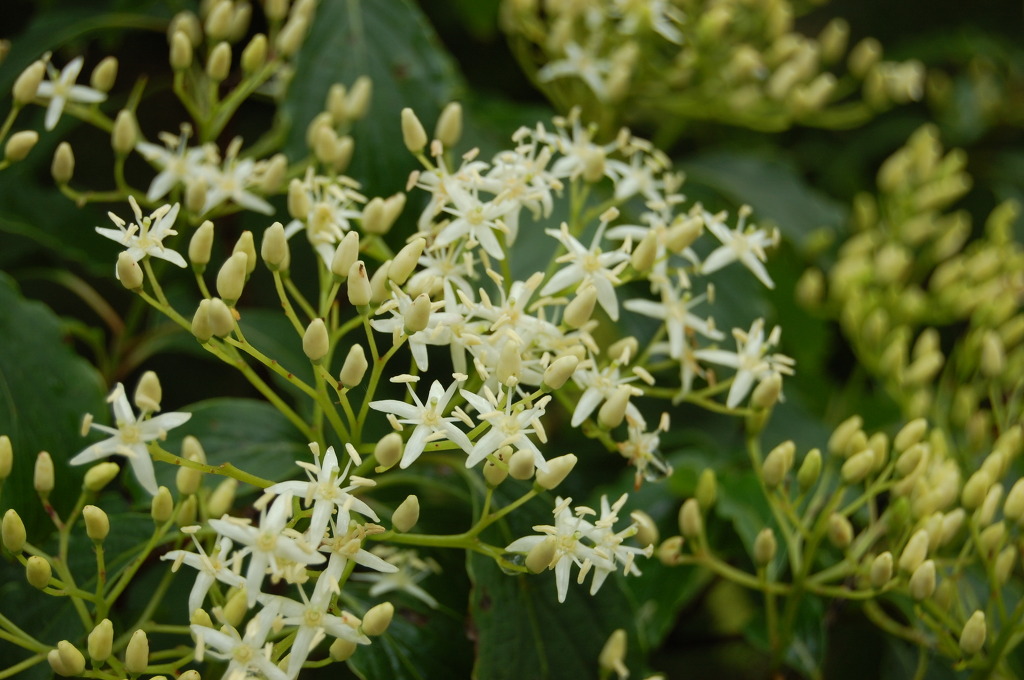 꽃은 5∼6월에 흰색으로 피며, 취산꽃차례[聚揀花序]에 달립니다. 열매는 핵과로서 둥글고 지름 6∼7mm로 9∼10월에 검게 익습니다.